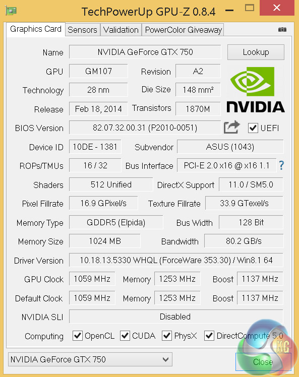 GPUZ gives us a break down of what the add-on GTX 750 has going on. For reference, GPU drivers were updated to the latest at the time of testing. We used the Nvidia 353.30 – 23/06/15.