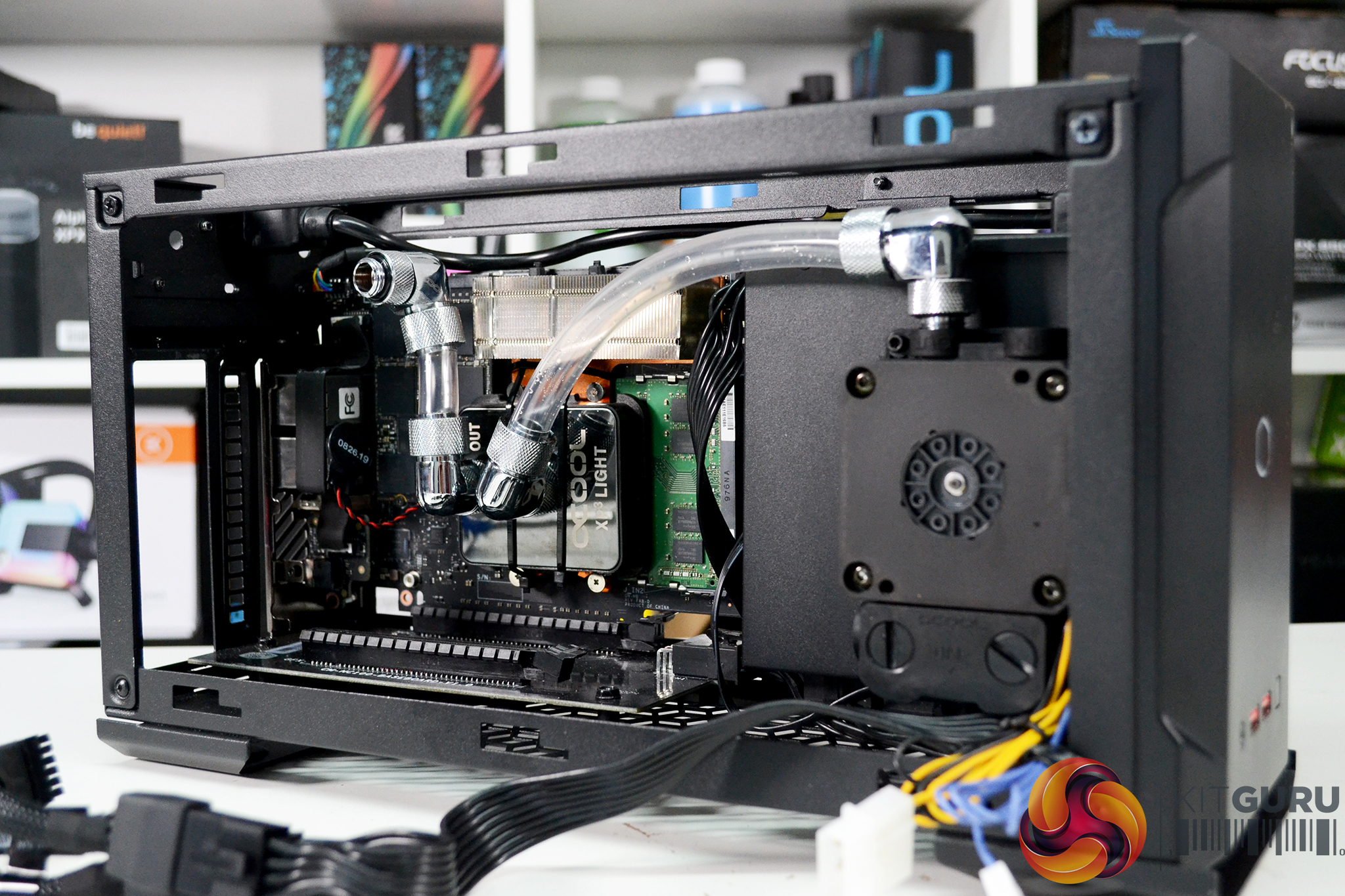 With the radiator installed, the rest of the system is piped up ready for filling, everything seems to fit inside the case well. Surprisingly, it wasn’t as difficult as expected to connect up the tubing, the extra space inside the chassis created by removing the NUC 9 Extreme Compute Element fan shroud, the stock GPU cooler as well as using flexible soft tubing was a real bonus.
