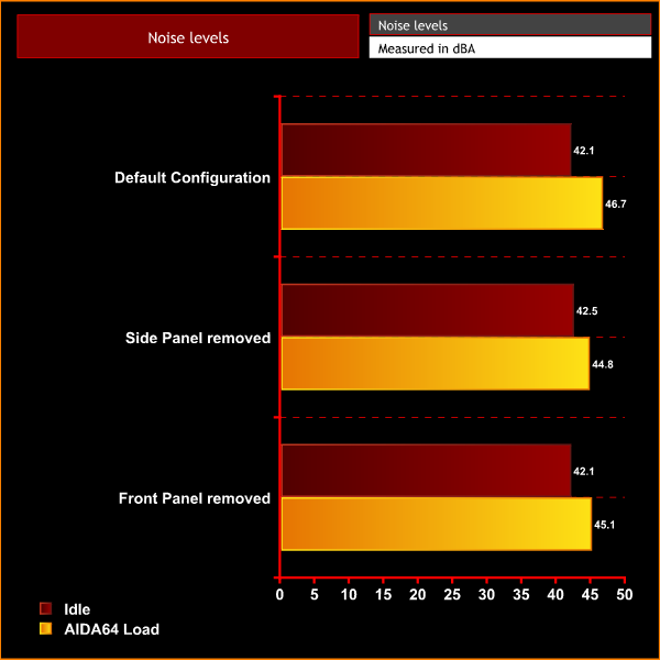 Like in our thermals test, we test noise levels with the system case in various configurations, to see how this affects noise. The same configurations from thermal testing will be used to test noise levels. The ambient noise levels (noise floor) in the room is 37.4 dBA. We will run AIDA64 stressing CPU, cache and GPU for 10 minutes to measure noise levels in each configuration. After leaving the system for 30 minutes to cool, we will then measure noise levels with the system idle on the Windows desktop.