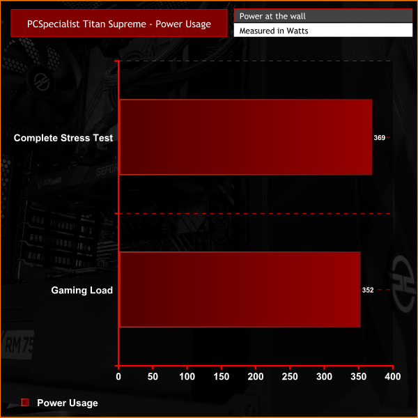 The maximum power draw from the wall socket was measured at just under 370W during a full system stress tests using AIDA64. Even with current high energy costs in the UK the PCSpecialist Titan Supreme shouldn't break the bank under full load when drawing under 400W which is good for the pocket.