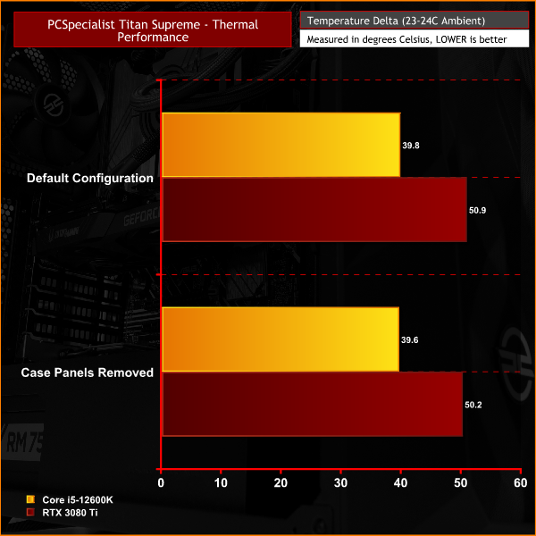 An important characteristic of any gaming PC is how it handles the cooling of the internal components, To see how the PCSpecialist Titan Supreme stacks up, we ran a series of tests with the case in its default configuration and then with the tempered glass side and top filter removed.