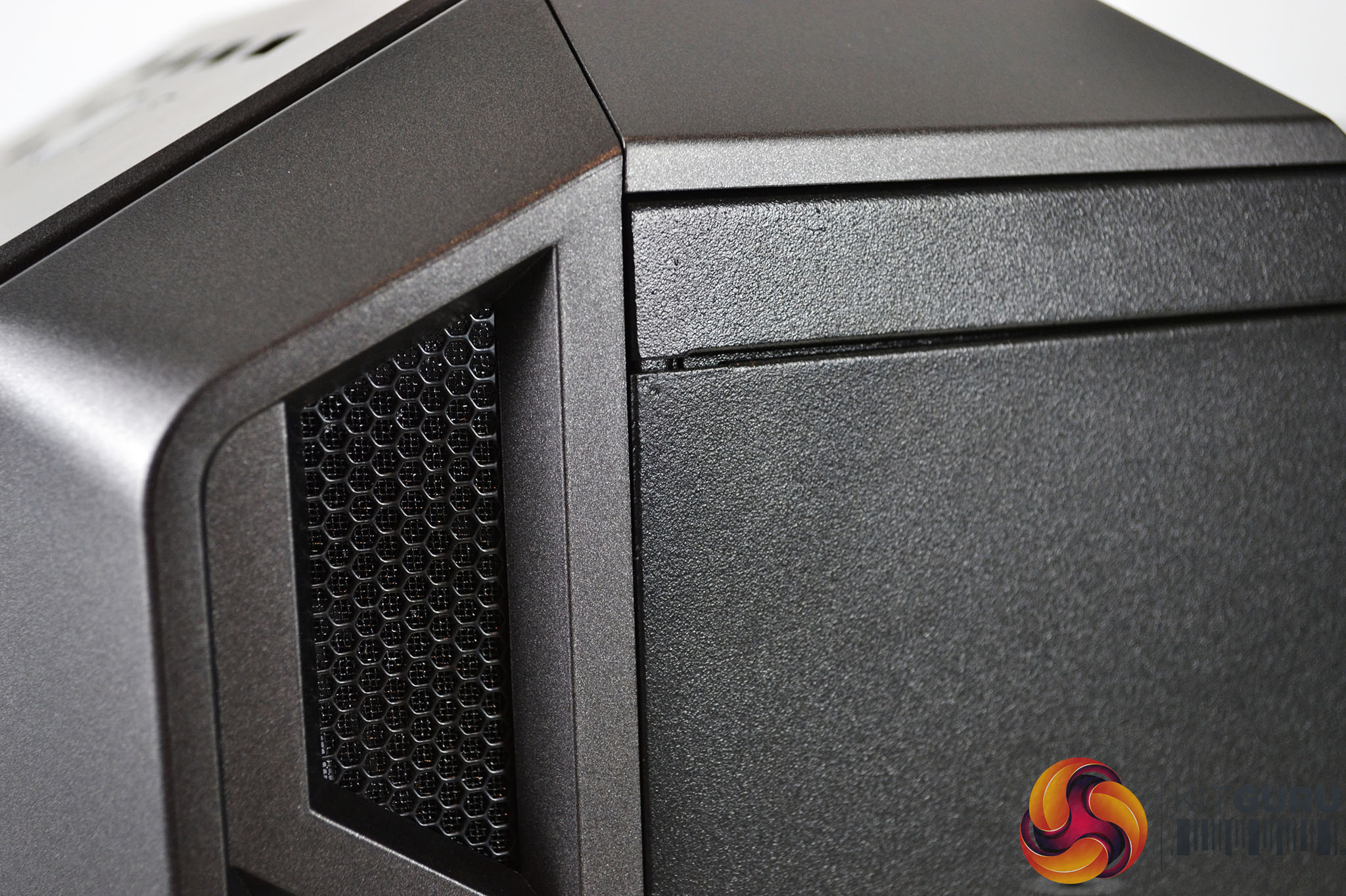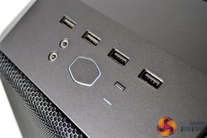The front panel and the top I/O panel are plastic with a gunmetal finish while the steel side panel and the chassis frame are black. The front panel I/O is located at the top of the front panel for convenience and consists of two USB 2.0 Type-A ports, two USB 3.0 Type-A ports, 3.5mm audio jacks for headphones and a microphone as well as power, reset buttons and power/storage activity LEDs.