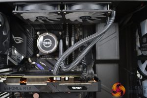 General build quality and cable management seem to be of a high standard. The left-hand side of the case looks quite neat, however, there are one or two cables that could have been routed differently to make the area look a little tidier and the tubing from the AIO cooler looks a little messy but overall, the build has a professional finish to it.