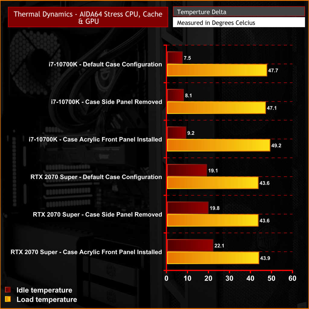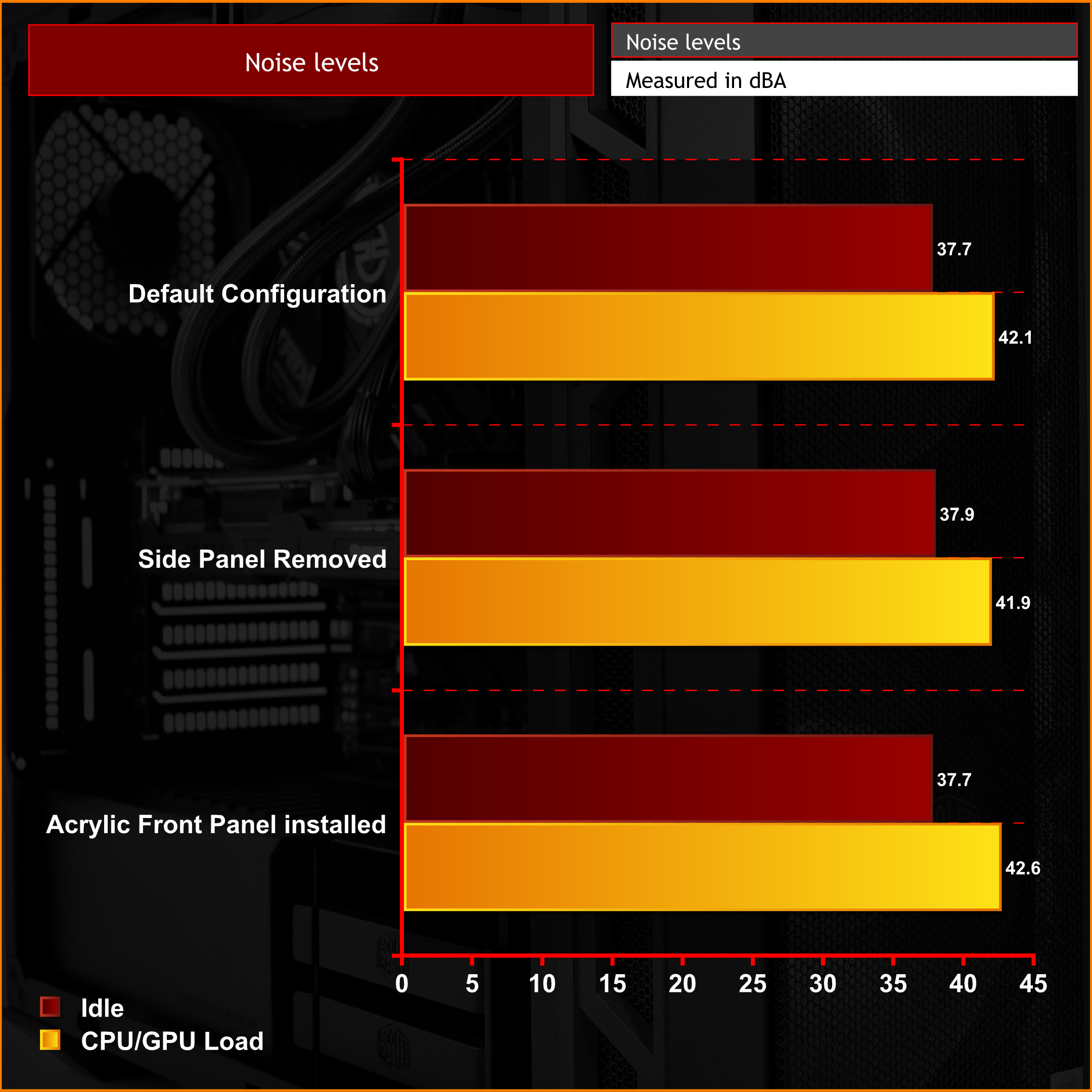 Removing the side panel or installing the solid acrylic front panel had very little effect on thermal performance, so in either configuration, users will be pleased to know that system temperature will be under control, even during intense heavy workloads.