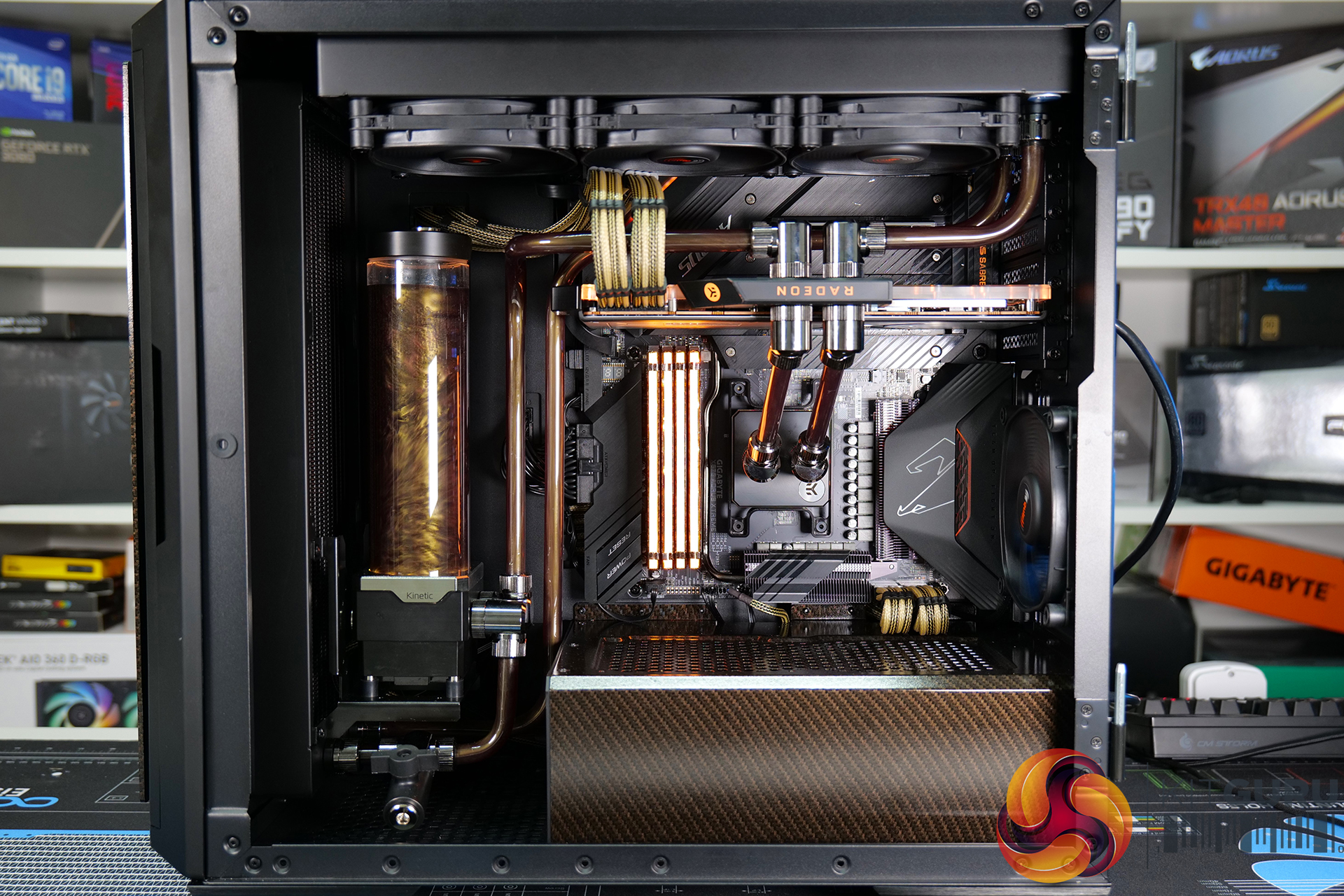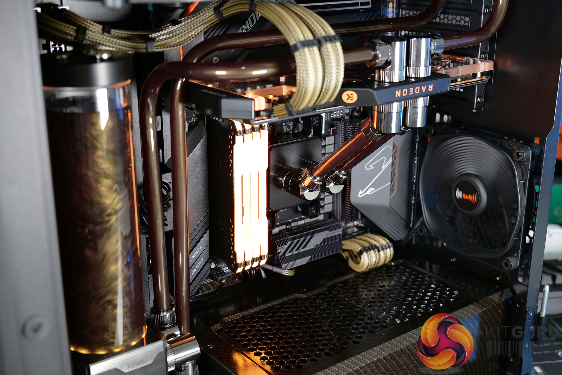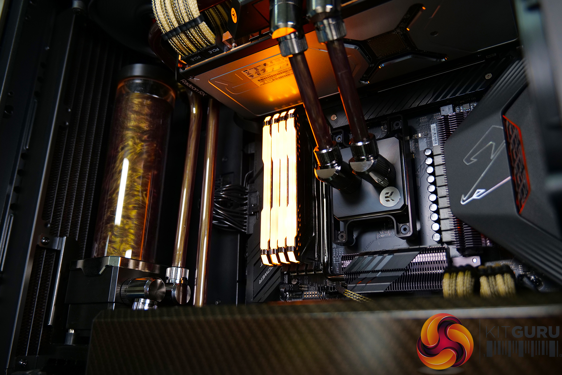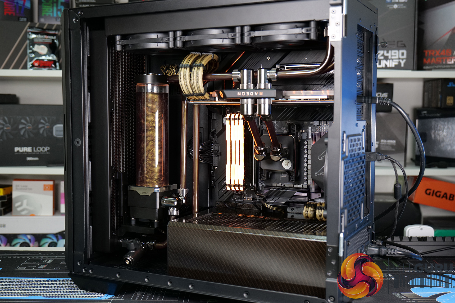 A high specification system such as this requires advanced cooling. An EKWB full custom cooling loop was built to cool both the CPU and GPU, using a full cover EK-Quantum Vector RX 6800/6900 D-RGB block for the graphics card and an EK Magnitude – AM4 Copper + Acetal block for the CPU. Mayhems mixed us a one-off bottle of their end-of-life Aurora Hydra Black Gold coolant for this project; the fluid was only used for a short time, then drained and flushed from the system, but it looked great for the video.