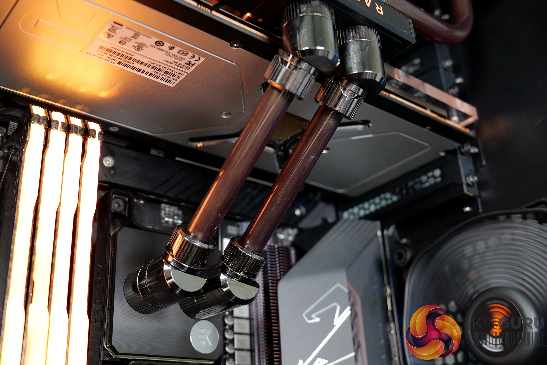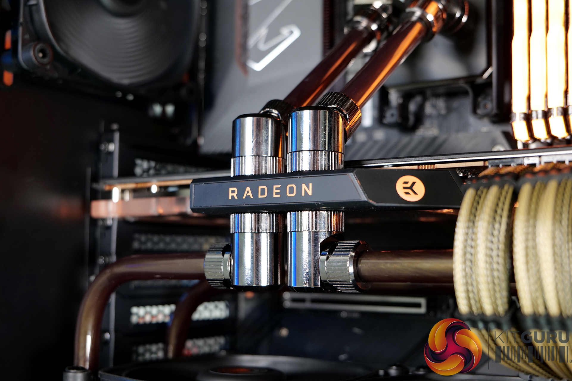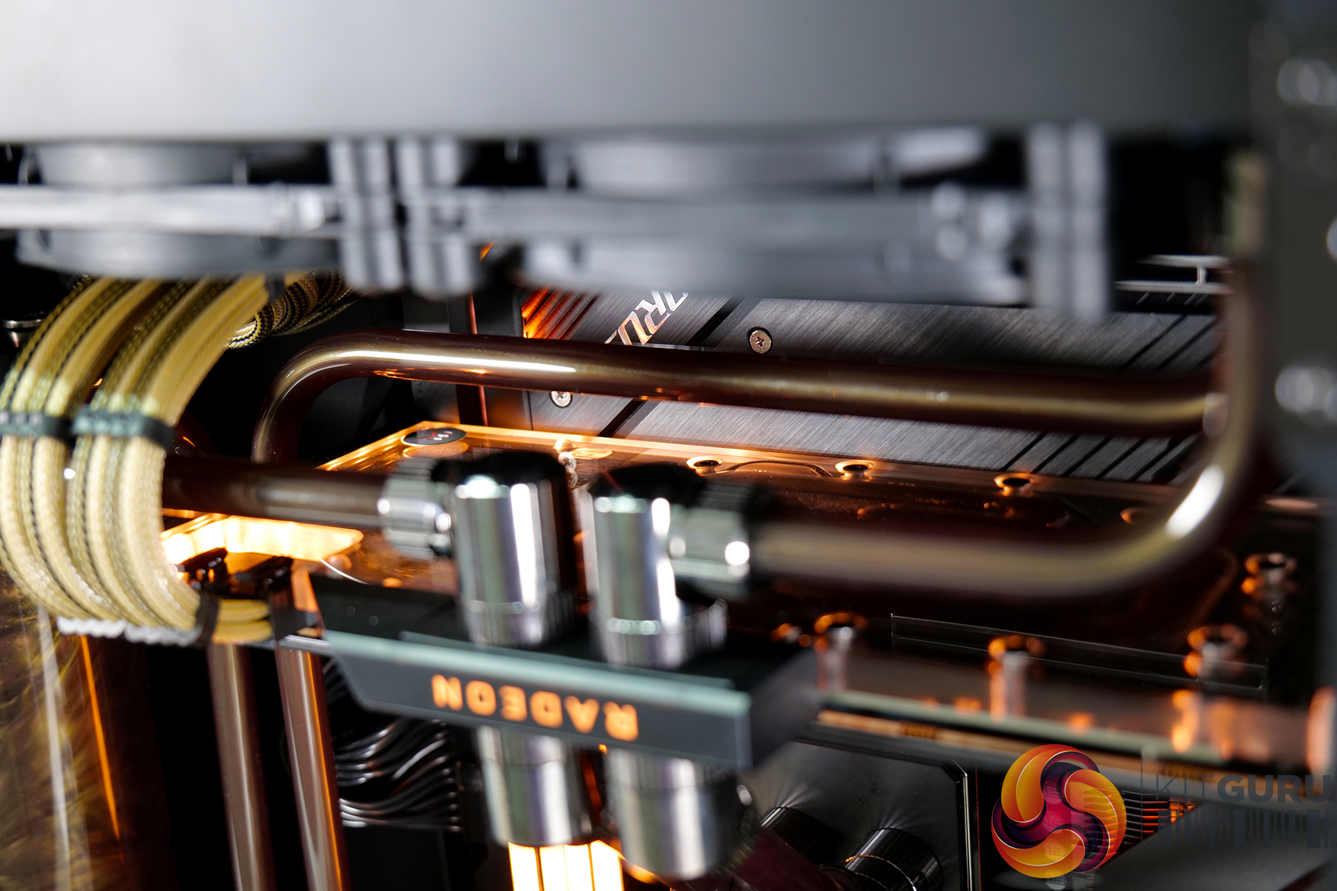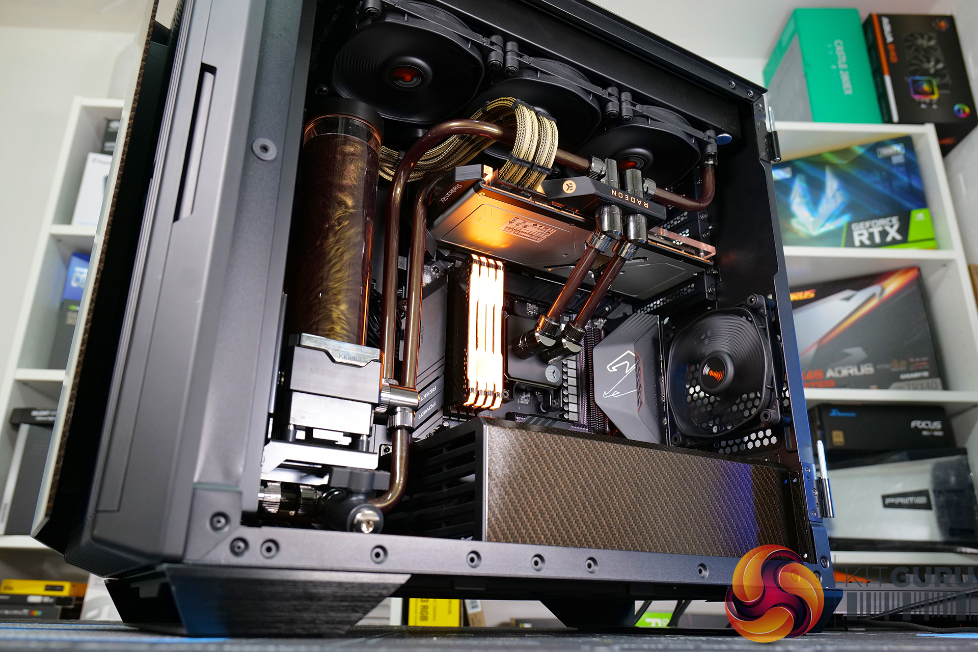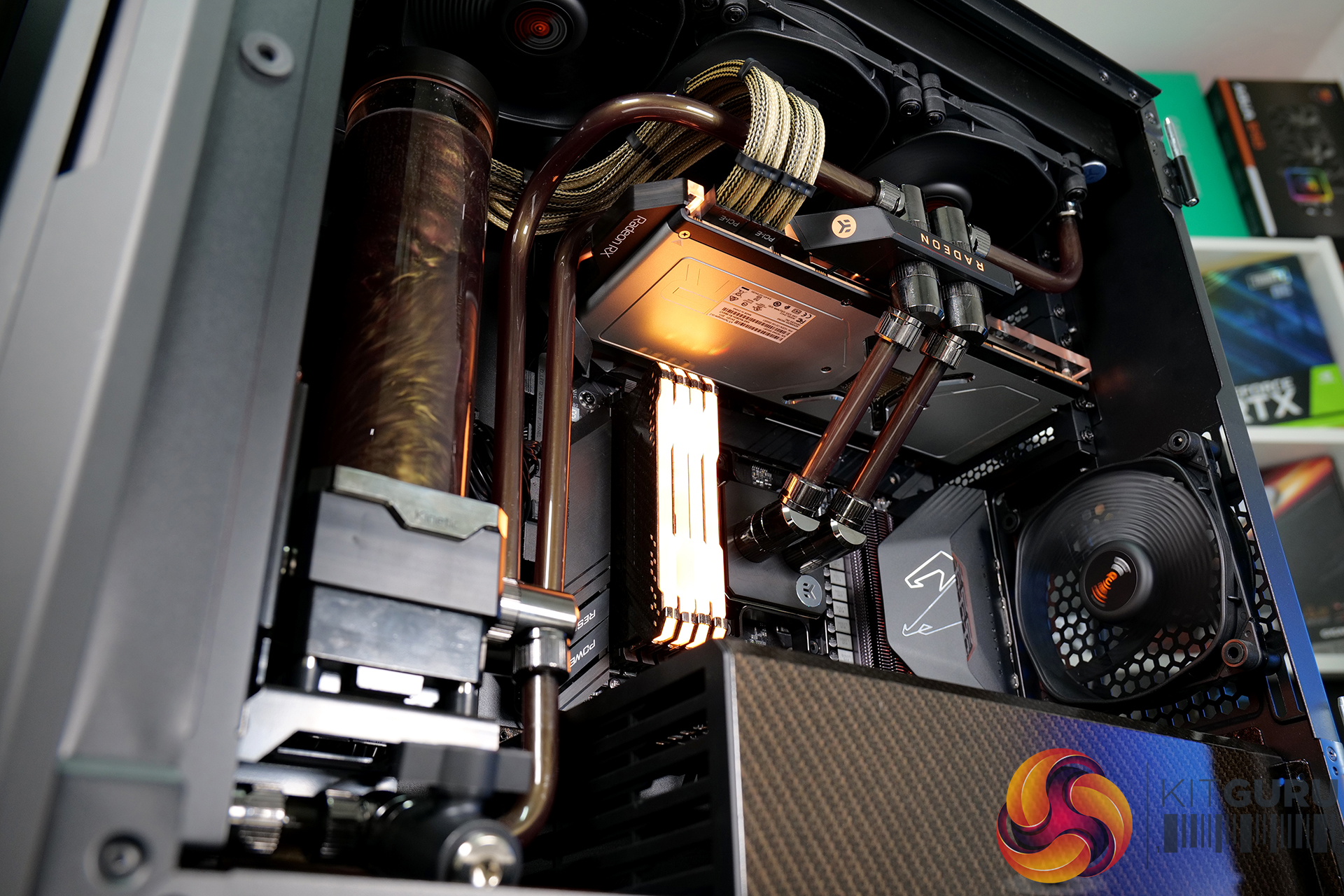 A high specification system such as this requires advanced cooling. An EKWB full custom cooling loop was built to cool both the CPU and GPU, using a full cover EK-Quantum Vector RX 6800/6900 D-RGB block for the graphics card and an EK Magnitude – AM4 Copper + Acetal block for the CPU. Mayhems mixed us a one-off bottle of their end-of-life Aurora Hydra Black Gold coolant for this project; the fluid was only used for a short time, then drained and flushed from the system, but it looked great for the video.