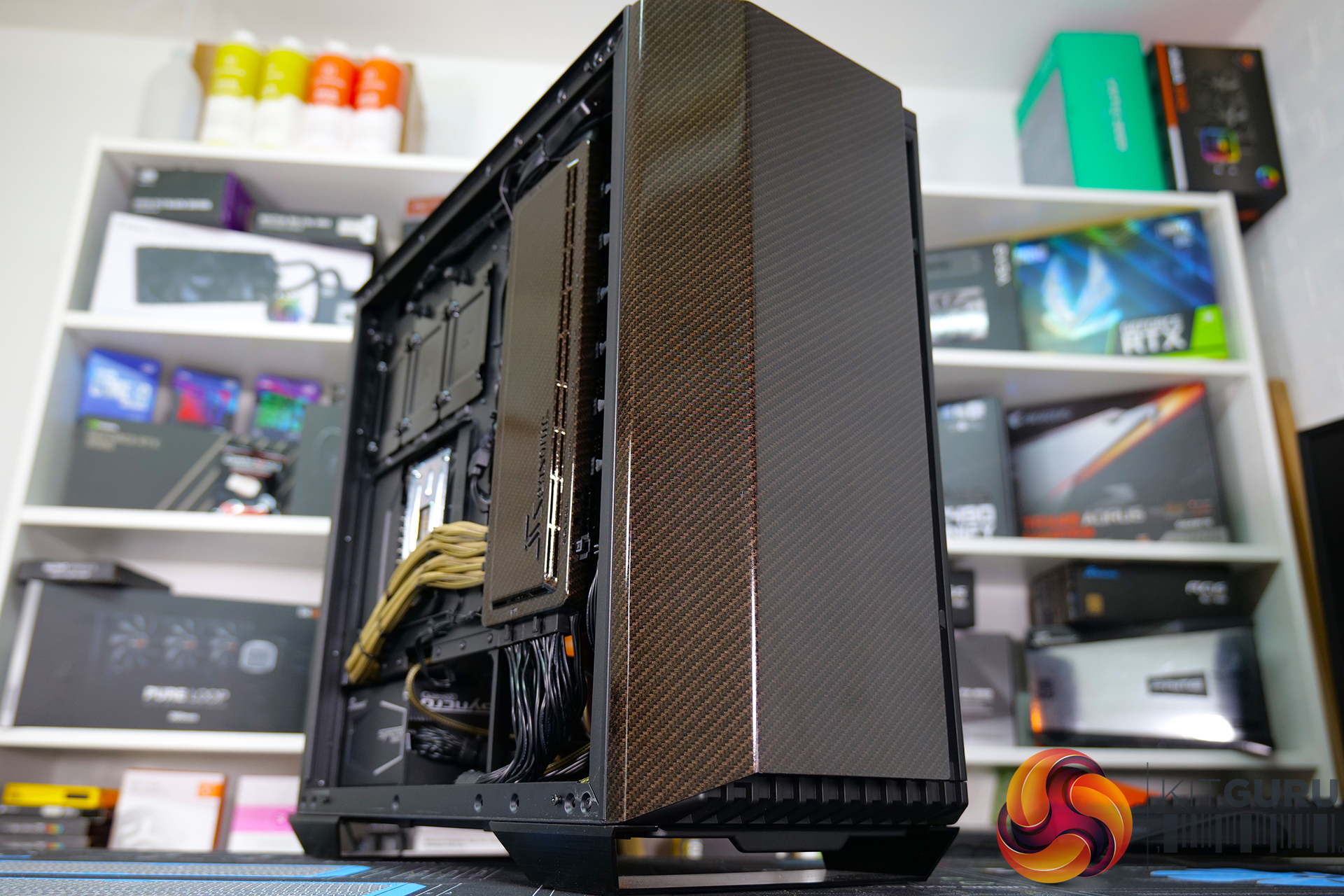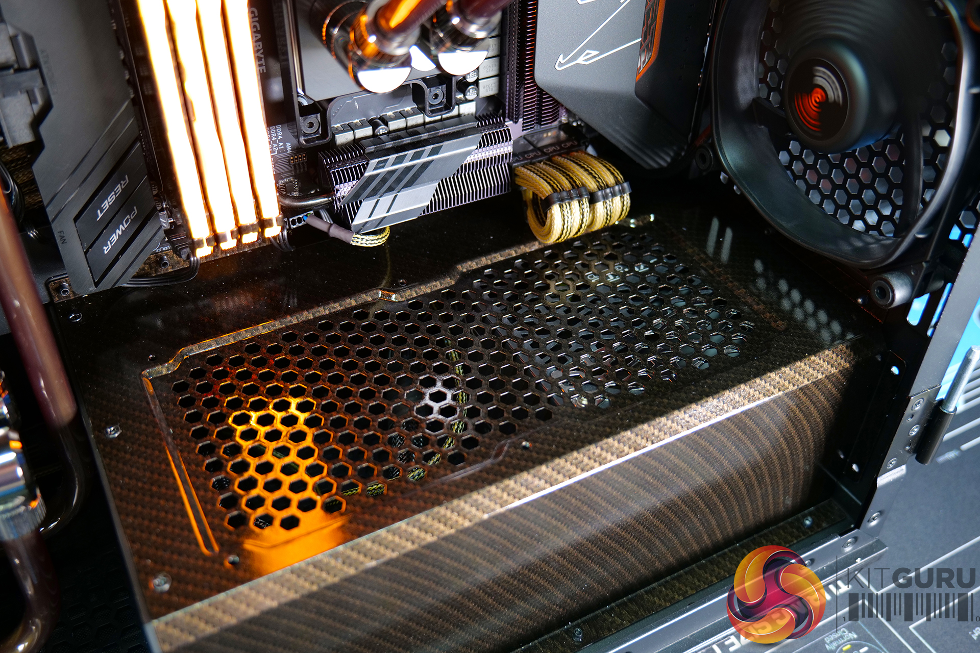 In keeping with the gold carbon fibre hydrographics theme, subtle highlights have been planned for this system including custom sleeved cables and the coolant used in the custom cooling loop. The Seasonic SYNCRO Q704 chassis is equipped with a Seasonic SYNCRO CONNECT DGC-750 power supply and CONNECT Module, to assist system builders with cable management organisation. Shorter stock modular cables than usual are supplied with the Seasonic CONNECT module, making it easier to create our custom cables.