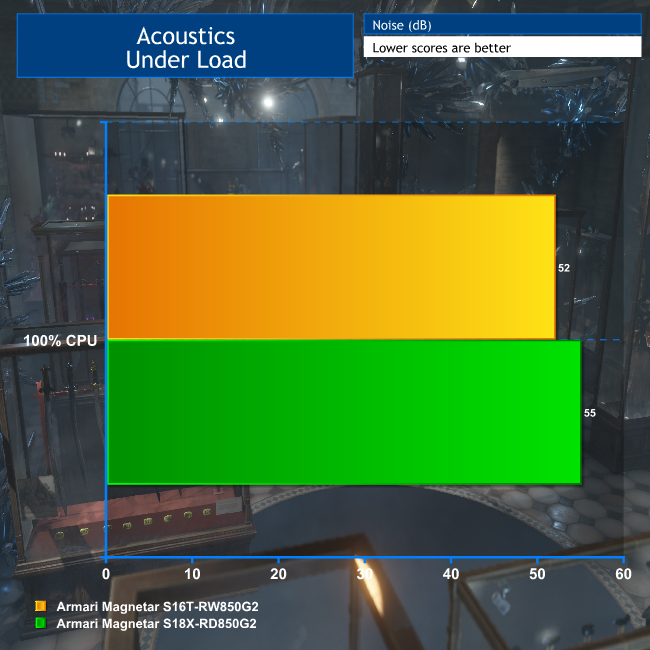Unsurprisingly, with the same chassis and same water cooling system, both systems produce similar amounts of noise under load. The Threadripper's average noise of 52dB is not particularly quiet, but it's not deafening either. The Intel system is only a few dB louder, although this is just about noticeable. When you consider how many cores both these systems have and how much multi-threaded CPU power they can deliver, they're not really sonic nuisances.