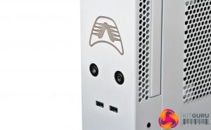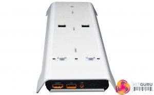 There are two USB 2.0 ports on the front, plus four USB 3.1 on the rear. A PS/2 keyboard/mouse combo port sits alongside two of USB 3.1 ports. There's also a USB 3.1 Type-A alongside USB 3.1 Type C. A single Gigabit Ethernet port is available. Five minijacks plus optical S/PDIF provide eight-channel audio connectivity. Some versions of this chassis also include a built-in breakout box for the HTC Vive (shown above), since this system is particularly targeting VR content creation.