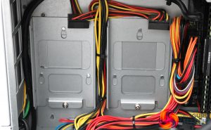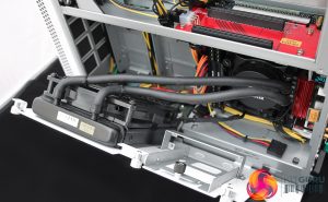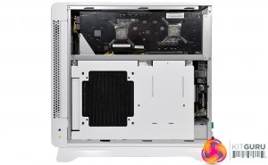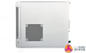 Fans on the top draw air from the graphics cards underneath and there's a pop-out filter on the front that can easily be cleaned to ensure optimum airflow. The PSU is not hot-swap, because obviously there's only one of them (note that the picture above shows the 460W version, not the 750W we were sent). But it can easily be slid out and replaced without having to take the side panel off. Removing the side panel shows just how tightly packed the components are inside.