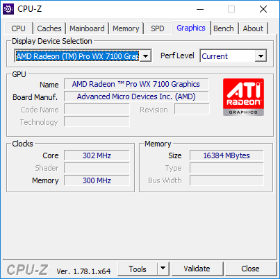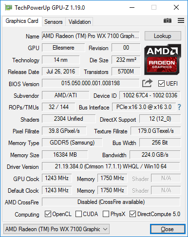 The AMD fest continues with the Radeon Pro Duo. As we hinted earlier, this is essentially two Radeon Pro WX7100 cards packaged together, which is what CPU-Z and GPU-Z detect it as. So there are two GPUs with 2,304 Stream Processors apiece, and two lots of 16GB GDDR5 memory, for a whopping total of 32GB. There's a 256-bit memory interface for each GPU, and bandwidth is a reasonably hefty 224GB/sec, although here the top NVIDIA Quadros go a little further.