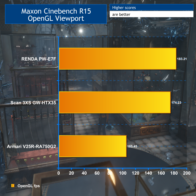 The Cinebench OpenGL results aren't quite so impressive. The AMD Radeon Pro Duo is decent for modelling, but not up with the high-end single-GPU graphics in the RENDA and Scan workstations. This graphics test is quite single-core clock-speed sensitive, which goes some way to explain the result, but not all.