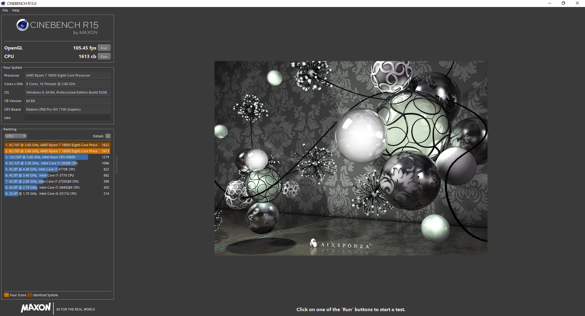 The CPU rendering portion of Maxon Cinebench R15 shows just how much processing power the AMD Ryzen 7 1800X packs in for the money. The RENDA system also sports eight cores and 16 threads, but clocked permanently to 4.2GHz.