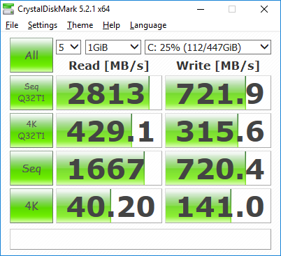 As we mentioned earlier in this article, the V25R–RA750G2 will ship with a Samung PM961 SSD, but Armari didn't have one available for review at the time of writing so shipped a similar OEM drive. Samsung claims 2,800MB/sec reads and 1,600MB/sec writes for the PM961, so the OEM drive isn't letting the side down too much with its performance abilities. The reads are the same, but the writes are about half as fast.