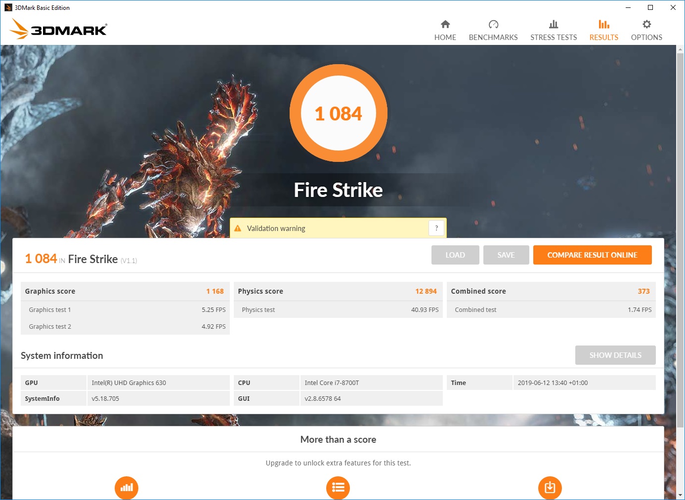 To test the Intel UHD 630 graphics further, we ran 3DMark Fire Strike. Note that the score shown below is the Overall result.