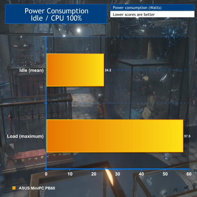 We don't have specific comparisons here, but when you consider that a full tower PC workstation might draw 100W or more when idle, and 400-500W when at full chat, this is a very miserly machine when it comes to power consumption. Sure, it will be doing way less work than a huge tower workstation, but most of the time it will be drawing more like the idle value, so this will be a very economical PC to run. It's also so quiet we didn't see the point in measuring its acoustic output because the background ambience was noisier.