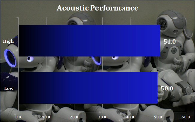 The system noise doesn't change much at all under load. However, it's also rather loud, considering that most systems will produce 30-40dB these days, even under load in some cases. You could easily reduce this by putting some of the many fans onto lower settings, as there really are a lot of them and you clearly don't need this amount of cooling when the system is idling.