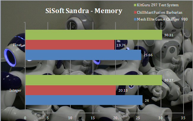 However, our reference system's 2,400MHz memory beats the 2,133MHz memory in the Mesh Elite Game Changer 980, although the latter still beats the 1,600MHz DDR3 in the Chillblast. Overall, the memory scores are precisely as we would expect.