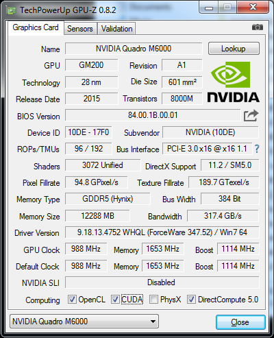 The next super-high-end inclusion is the graphics card. The NVIDIA Quadro M6000 is just about the most expensive graphics card on the market, but it's also the most powerful. This is the first of the high-end Quadros to move over to the NVIDIA Maxwell architecture, and the very first one to use the second-generation version, although 4000 and 5000 series spins are also planned.