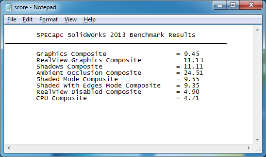 The benchmark generates individual scores for each test and computes composite scores for graphics and CPU performance. The reference system for computing the normalized ratio that produces a “bigger is better” score is a Dell Precision 690 with Xeon 5130 2GHz, AMD FirePro V3750 and 16GB RAM with 4x4GB ECC DDR2 667 MHz.