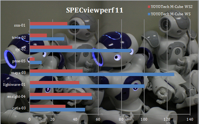 The YOYOTech M-Cube WS2 posts decent scores in SPECviewperf 11. However, the comparison results from the M-Cube WS shows how much modelling benefits from a higher clock speed, even if there are fewer cores.