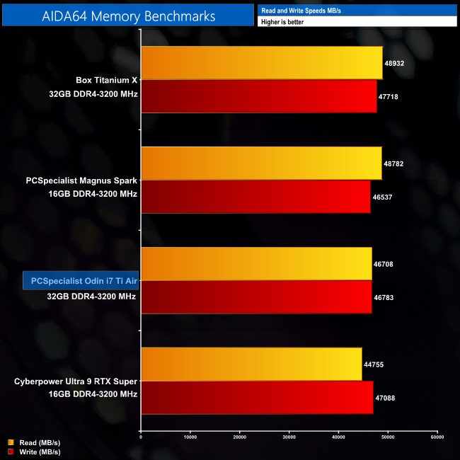 In AIDA64, our 32GB kit Corsair Vengeance DDR4-3200 delivers strong performance, both read and write results, capping out at 46708 MB/s read and 46783 MB/s writes.