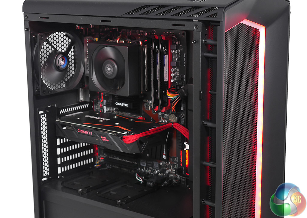As you will see in our video the build is neat and tidy and the red LEDs on the motherboard and graphics card match the red case lighting. If you prefer to mix things up the Aerocool case has a pair of lighting control buttons on the I/O that allow you to step through different colours and lighting modes.