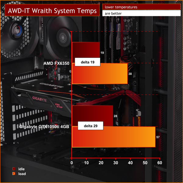 You need to add an offset figure to the recorded numbers to make sense of an AMD CPU temperature. In our experience this offset is 15 degrees C so the recorded numbers are a little shaky however the Delta between idle and loaded figures is rock solid. GPU figures can be taken as read.