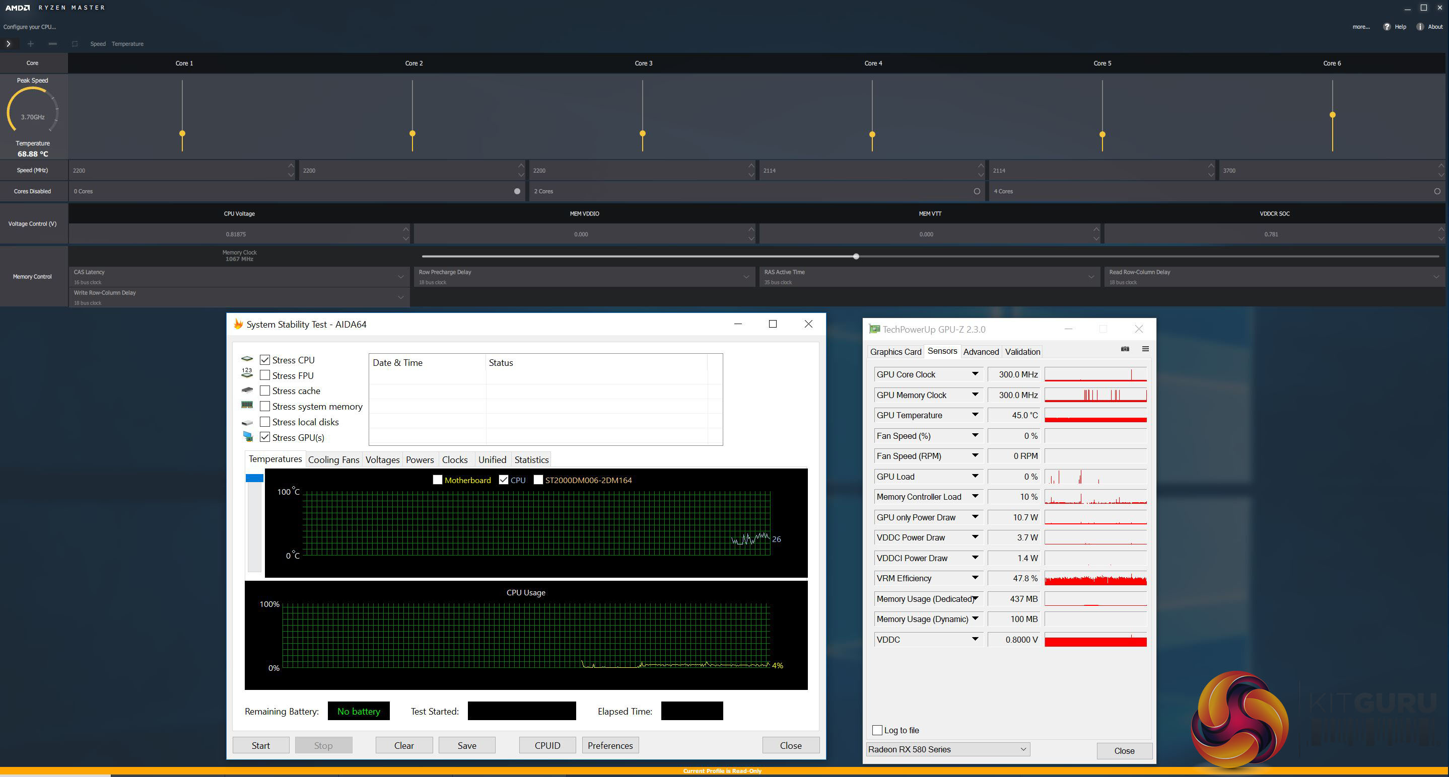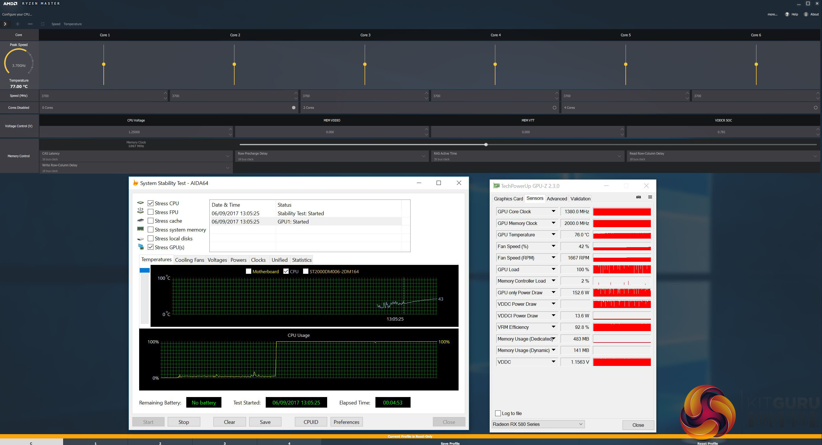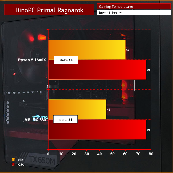 Both the CPU and GPU operate at a steady temperature of 76 degrees under load which is a good and safe low temperature. It is, of course, a coincidence that both pieces of silicon run at the same temperatures when you consider the Ryzen 5 uses a Corsair AIO liquid cooler while the MSI RX 580 has a conventional air cooler.