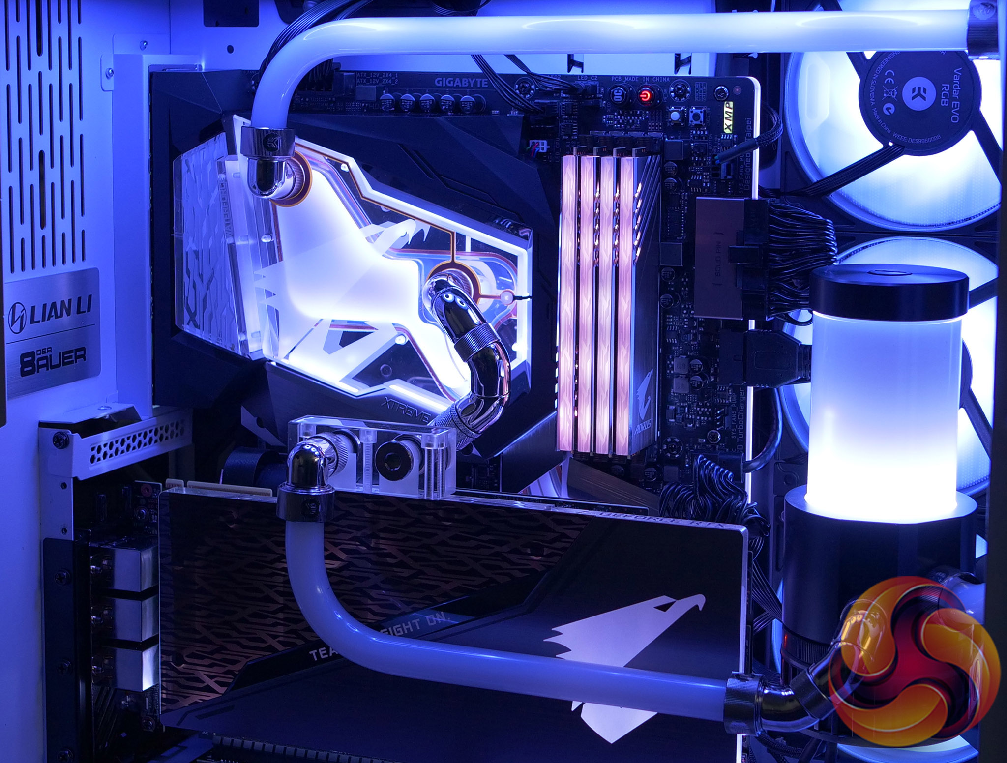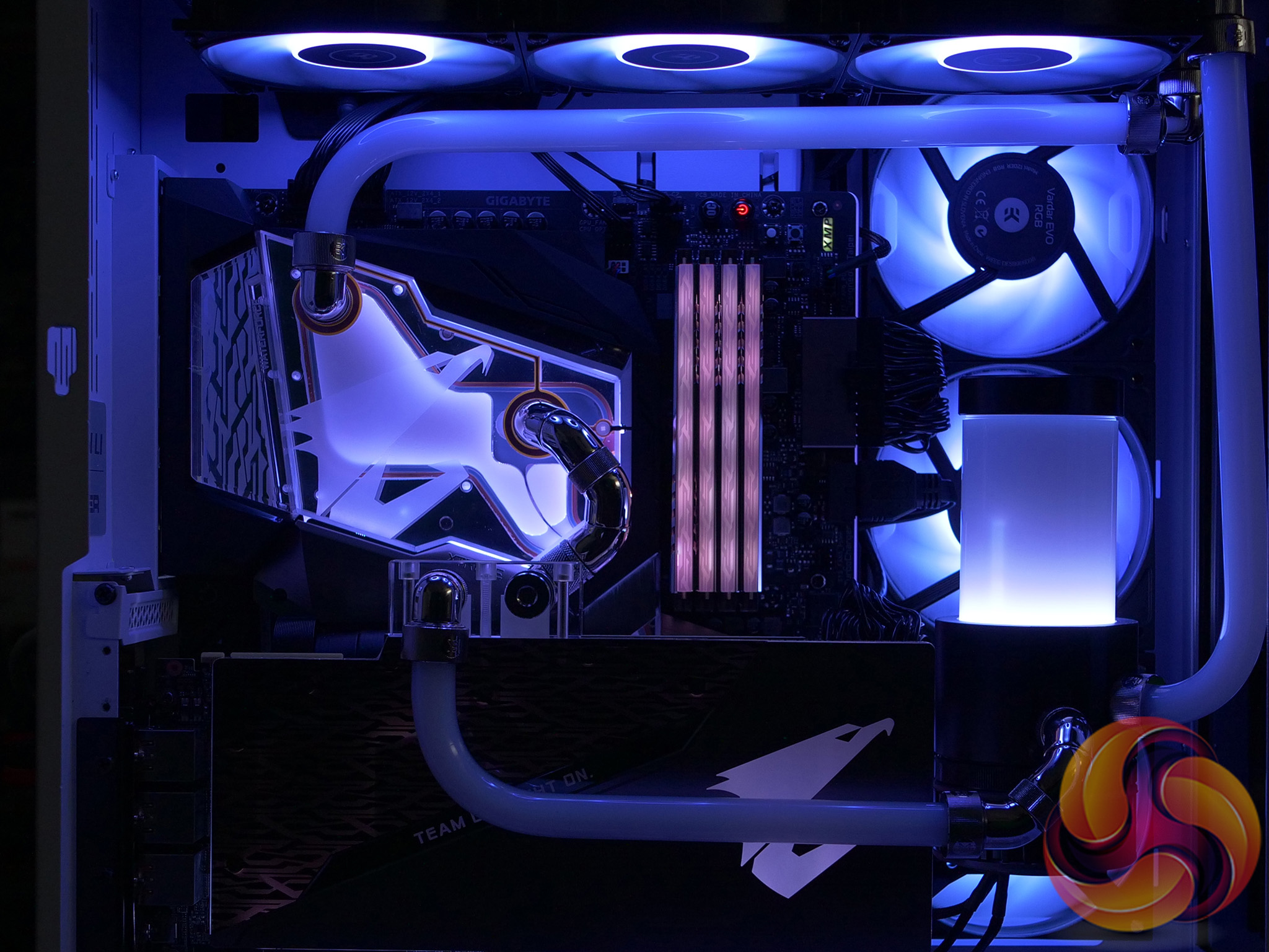 Once the WaterForce system was built we updated the BIOS, used the Smart Fan 5 facility to control the fans at a sensible speed, installed Windows 10 and then installed Gigabyte’s RGB Fusion utility. The Lian Li uses a black/white colour combination and we has chosen EKWB CryoFuel Solid Cloud White coolant so we actually had to think for a while about RGB settings.The default Rainbow Marquee looked a bit … gaudy … so we asked the EKWB Facebook group for their opinion.