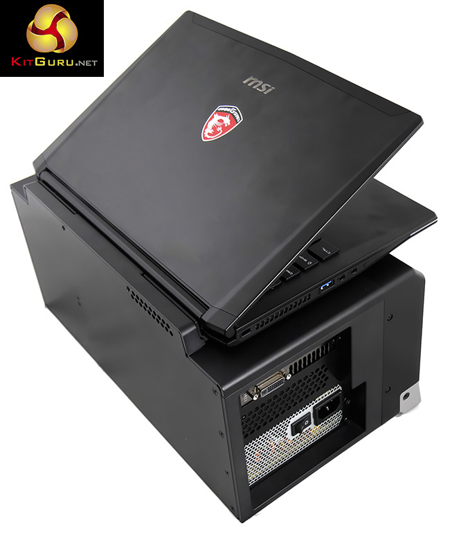 The laptop sits on top of the dock and engages with a PCI Express slot in the rear of the laptop which enables the MSI GTX 980 4GB Twin Frozr graphics card located within the dock. Also contained in the dock is a 450W FPS power supply to feed the necessary juice to the graphics card. We note that the drive bay that contained a 500GB hard drive in the preview system was empty in this retail version.
