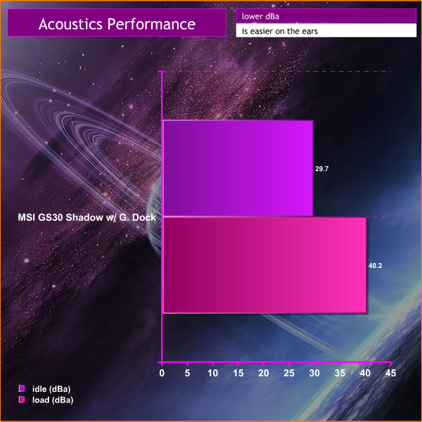 The combination of the 92mm fan in the dock, the power supply fan, the cooling on the graphics card and the CPU cooler in the laptop itself combine to make a fair amount of noise. It certainly isn't unbearable but it feels as though the GS30 Shadow would benefit from a more effective cooler. It is hard to believe that MSI couldn't find a quieter power supply for the GamingDock if they worked a little harder.
