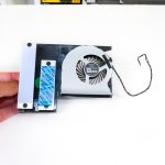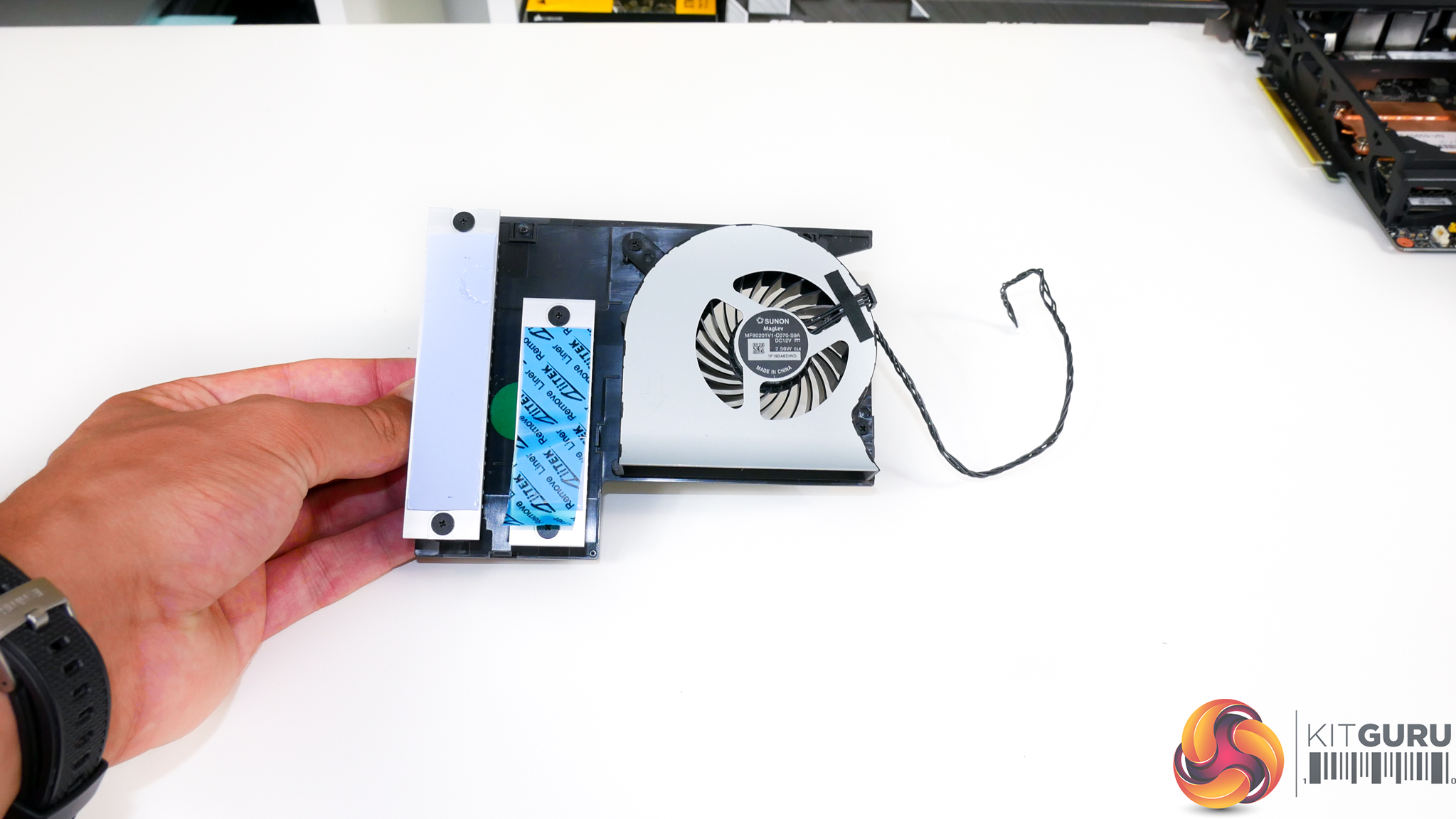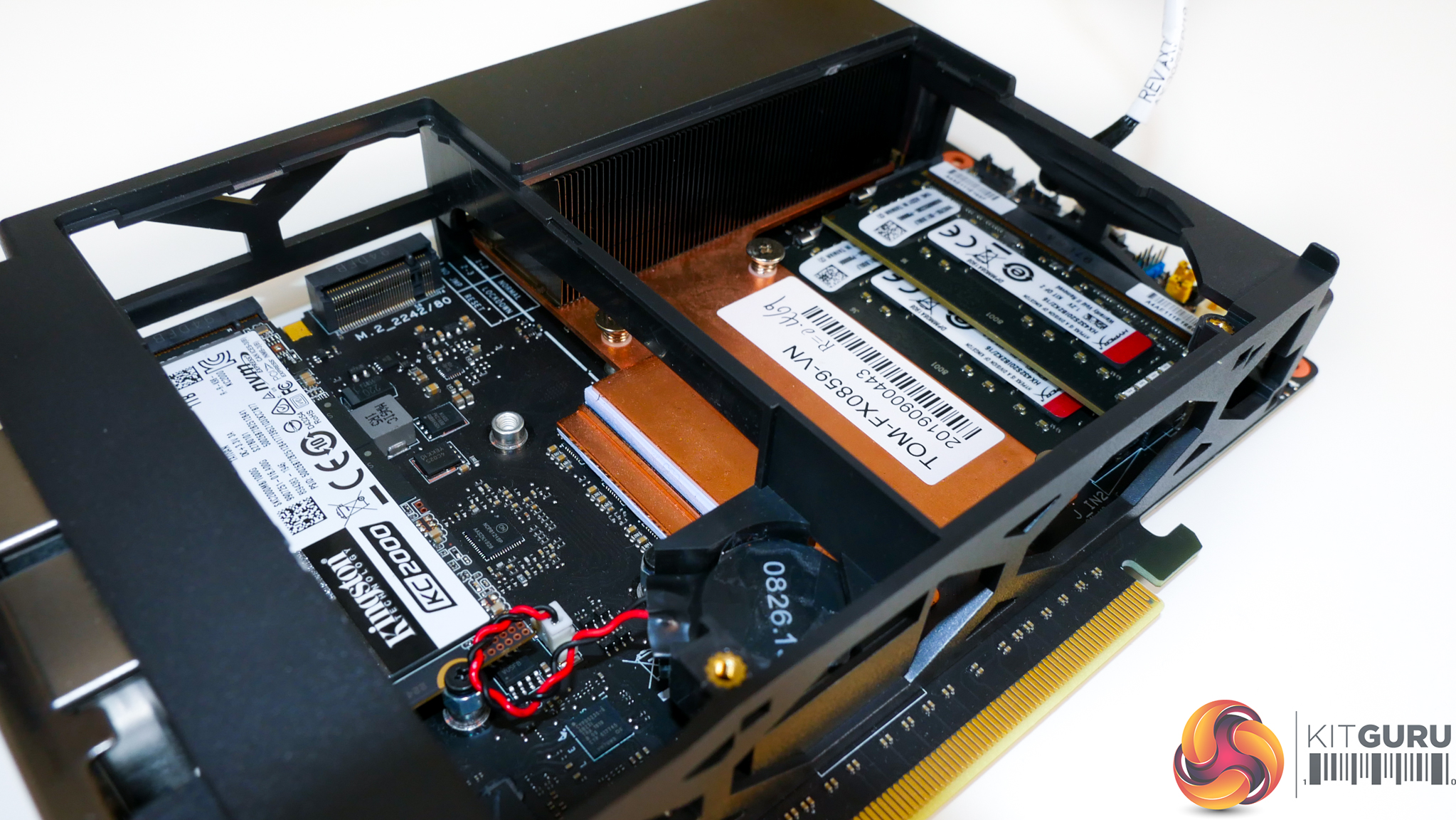 Removing the fan housing is a case of undoing two screws and pulling the assembly out of position. You can then slide off both mesh side panels to leave the exposed internals. The graphics card is held in place with screws near the IO shield. Once the power cable is disconnected and the PCIe slot latch is pushed out of position (which is difficult for people with big hands but a very infrequent issue for people building the system rather than disassembling it), the graphics card slots into position.