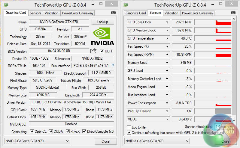 The GTX 970 graphics card is clocked at reference GPU speeds. Maximum core boost clock is listed as 1178MHz, however we observed spikes in the region of 1250MHz. This level, however, was unable to be maintained due to thermal throttling once 80°C on the GPU temperature was reached.