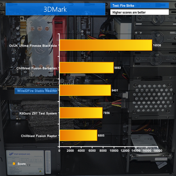 The Wired2Fire Diablo Reactor makes a solid start in 3DMark, however the blower-cooled GTX 970 struggles to maintain its maximum turbo clock speed and therefore loses points against the custom-cooled, factory-overclocked card used by Chillblast's Fusion Barbarian.