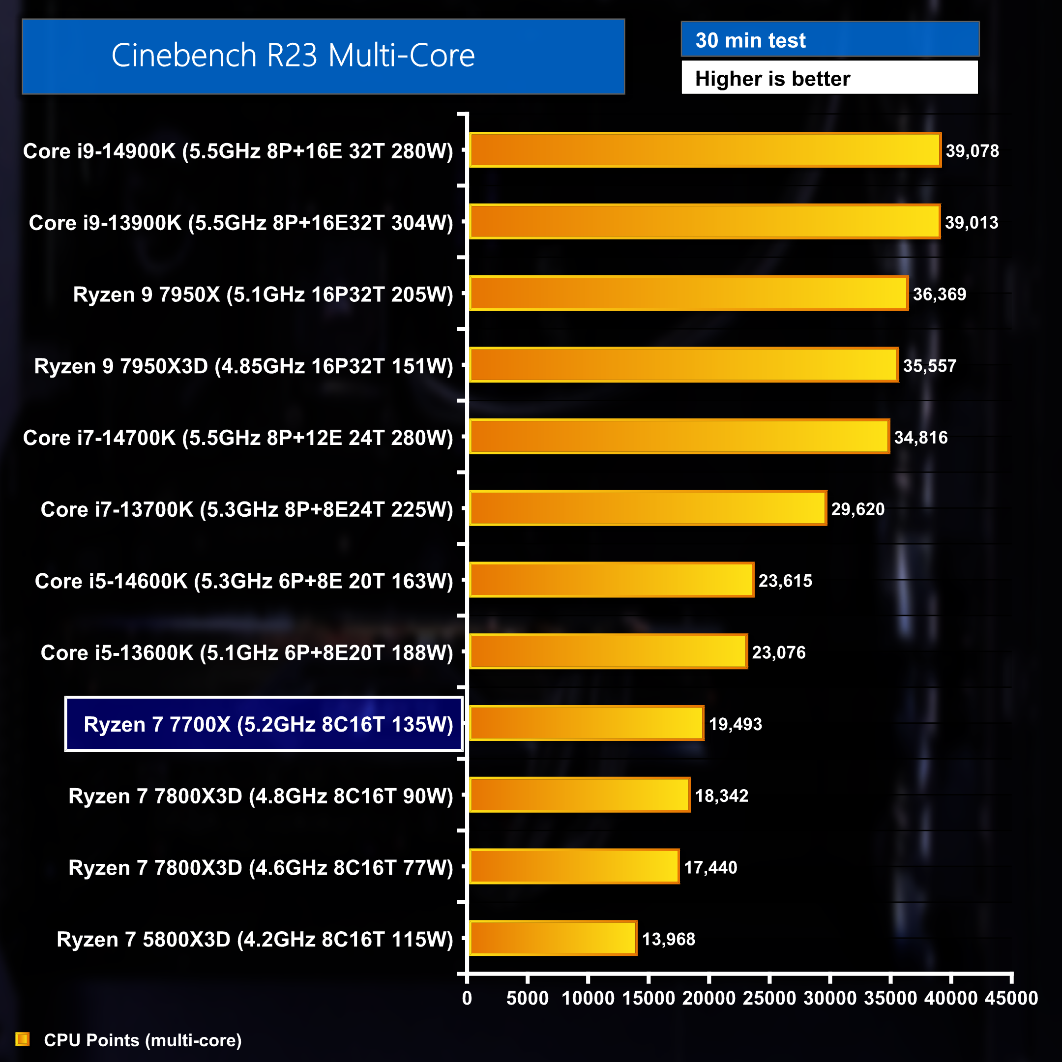 Running through a 30 min Cinebench R23 multicore benchmark produced a result of 19,493 points from the Ryzen 7 7700X. This places the system above both the 5800X3D and 7800X3D processors and some way behind the Intel Core i5-13600K CPU's we've tested in previously reviewed prebuilt desktop systems.