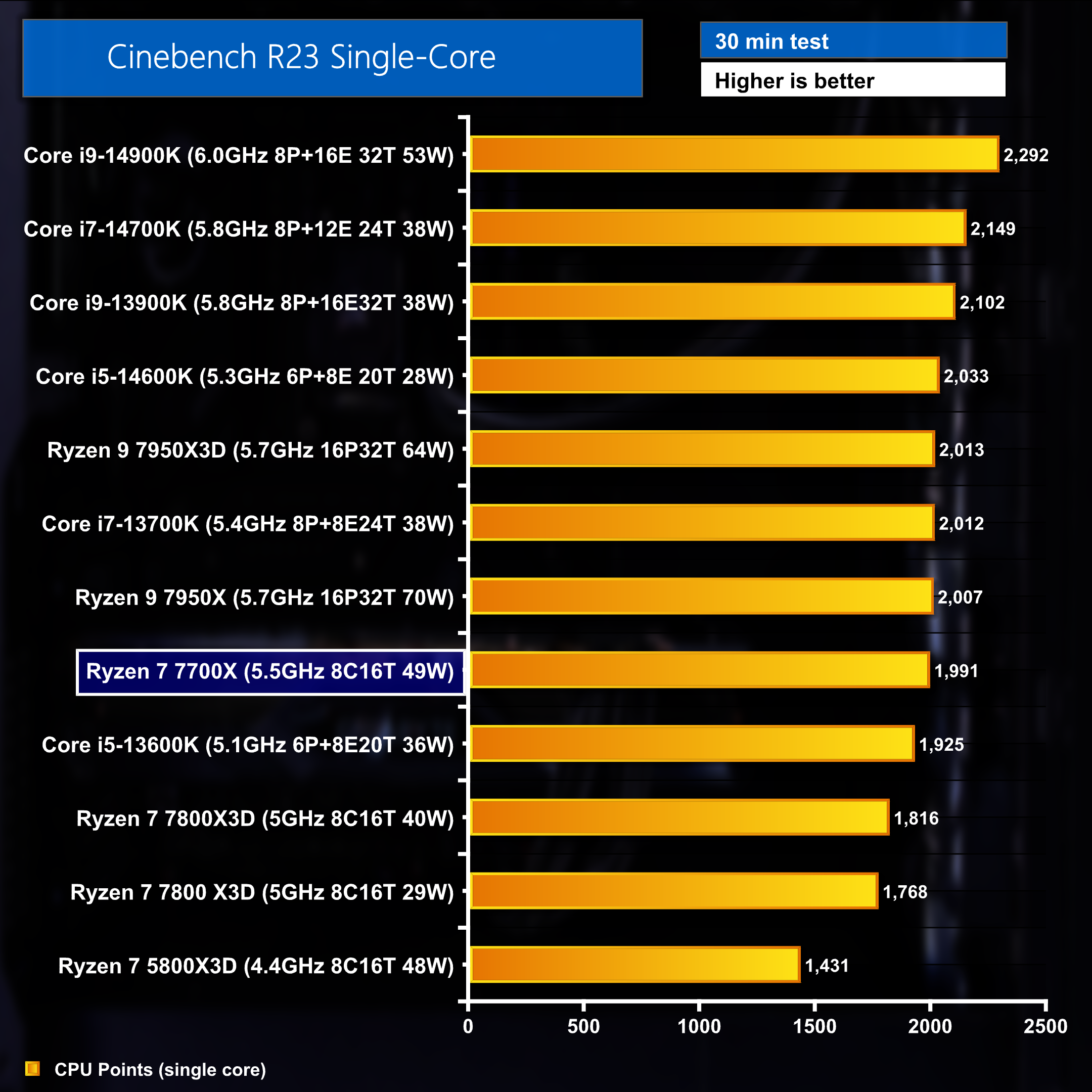Singlecore performance improves when run through a 30min single core variant of the Cinebench R23 benchmark, seeing the Ryzen 7 7700X leapfrog that same Core i5-13600k and achieve a score of 1991 points