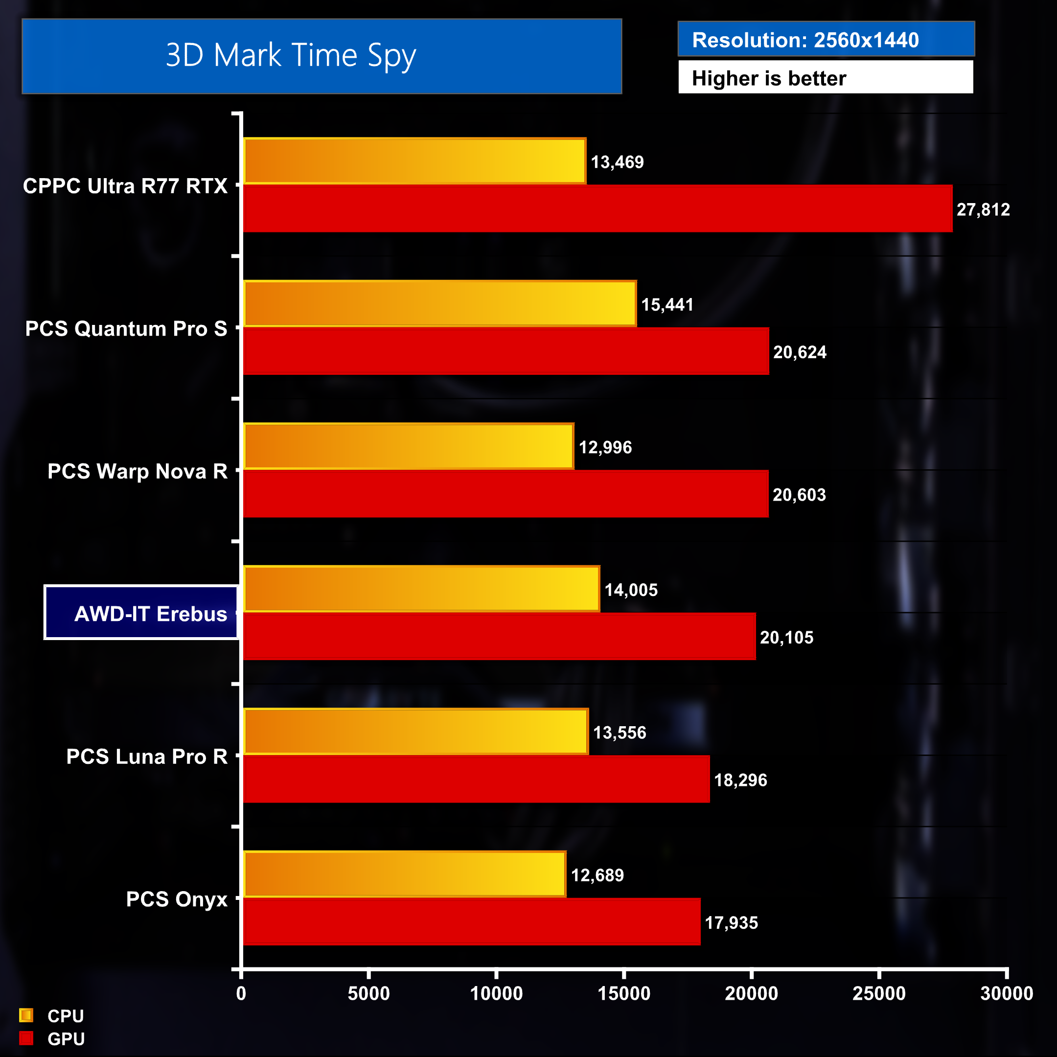 Testing system performance in 3DMark Time Spy benchmark results in a score of 20,105 points for the GPU and 14,005 points for the CPU. Landing the system close to the other prebuilts sporting an RTX 4070 Super when the data is sorted by GPU performance.