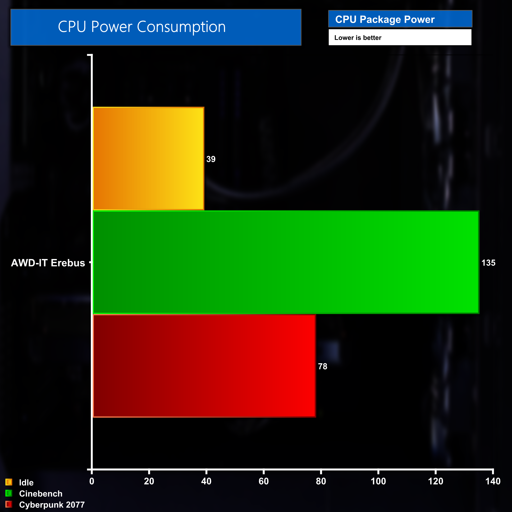 CPU package power consumption results highlight the great efficiency of the Ryzen 7 7700x, with the processor using just 78w during a sustained gaming test in Cyberpunk 2077.