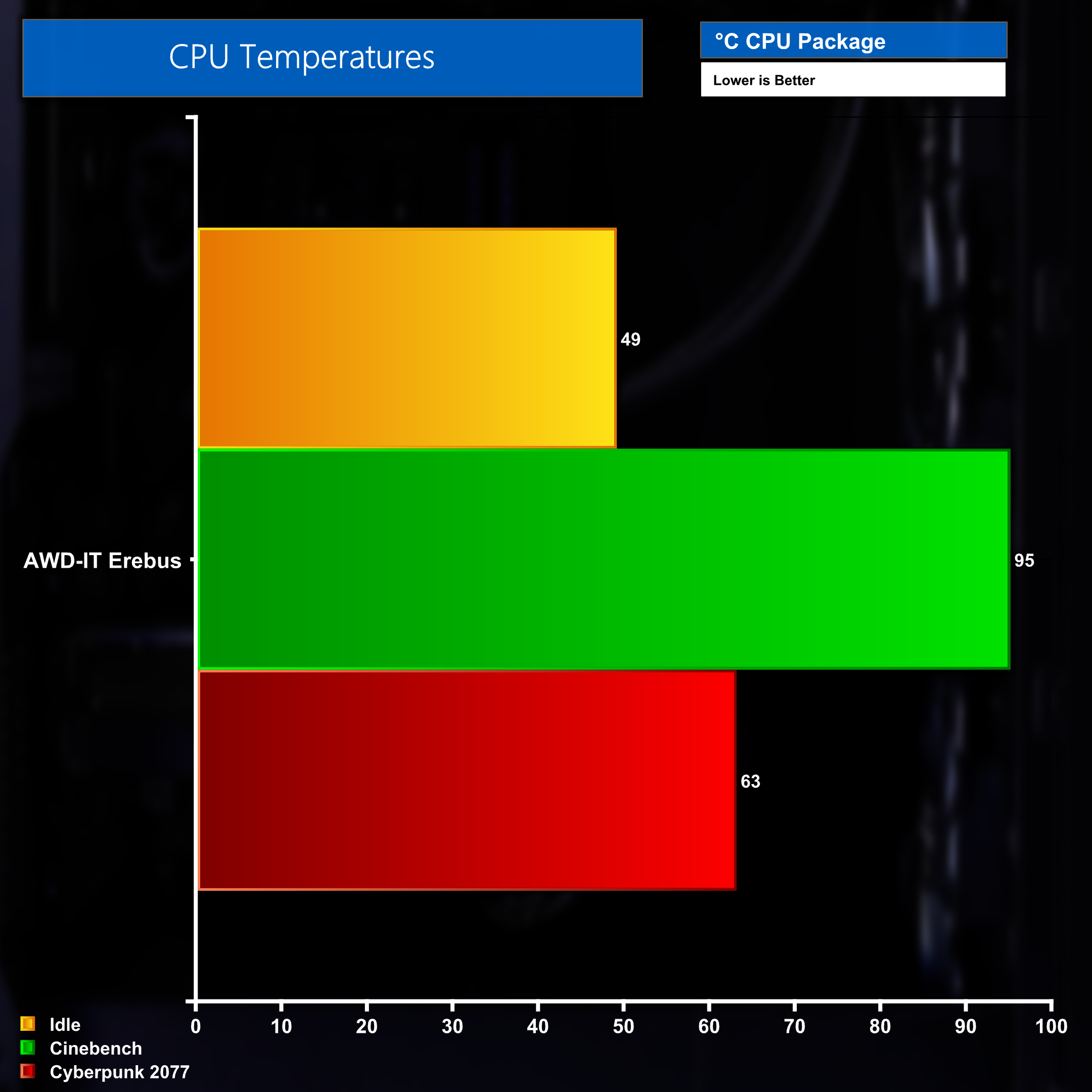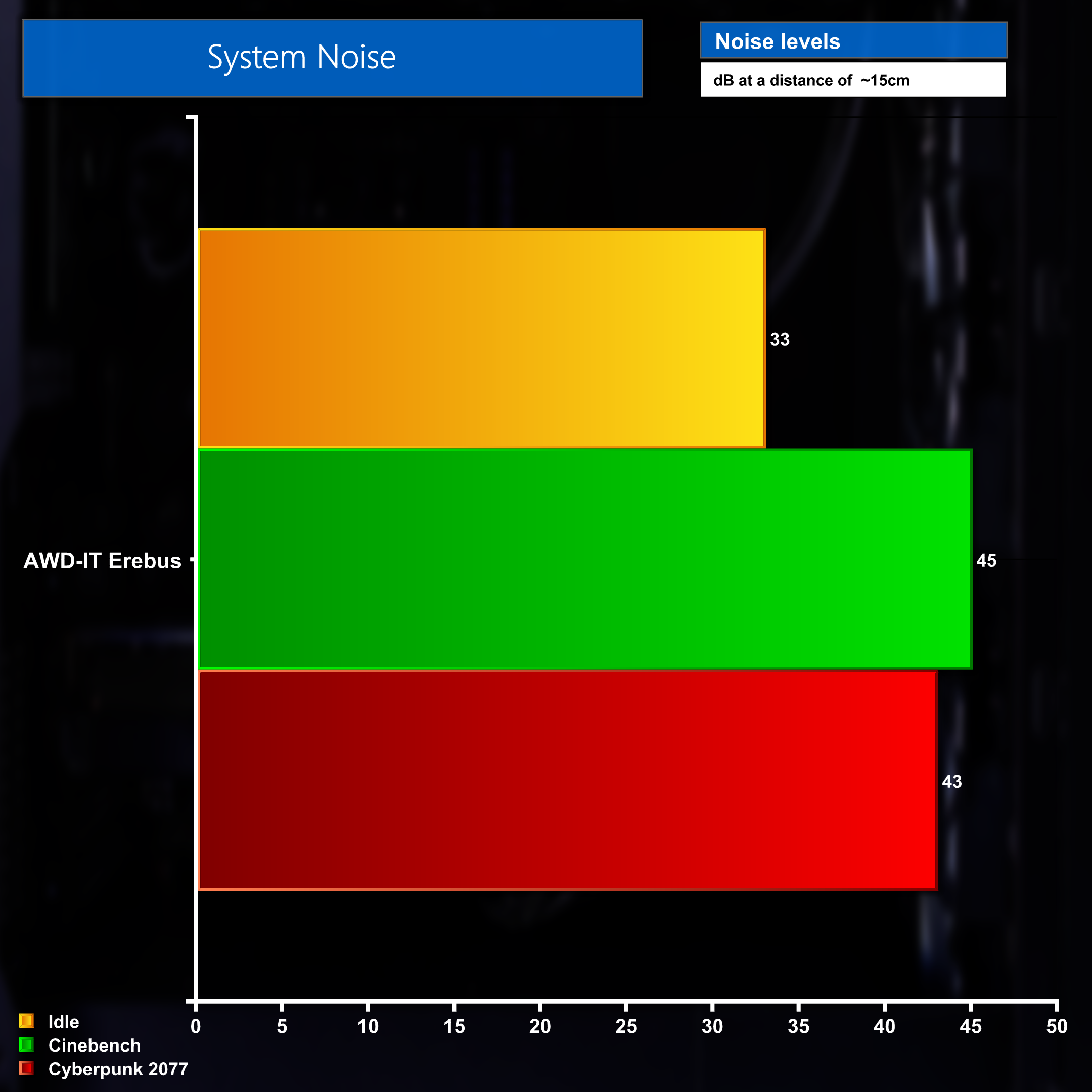 System noise peaked at 45 decibels during a Cinebench R23 multi core benchmark. The Erebus has a pretty aggressive fan curve by default – which could be tamed further with some tweaking. Although, the levels of fan ‘ramp up' may suit the warm temperatures we've been experiencing in the UK over recent weeks.