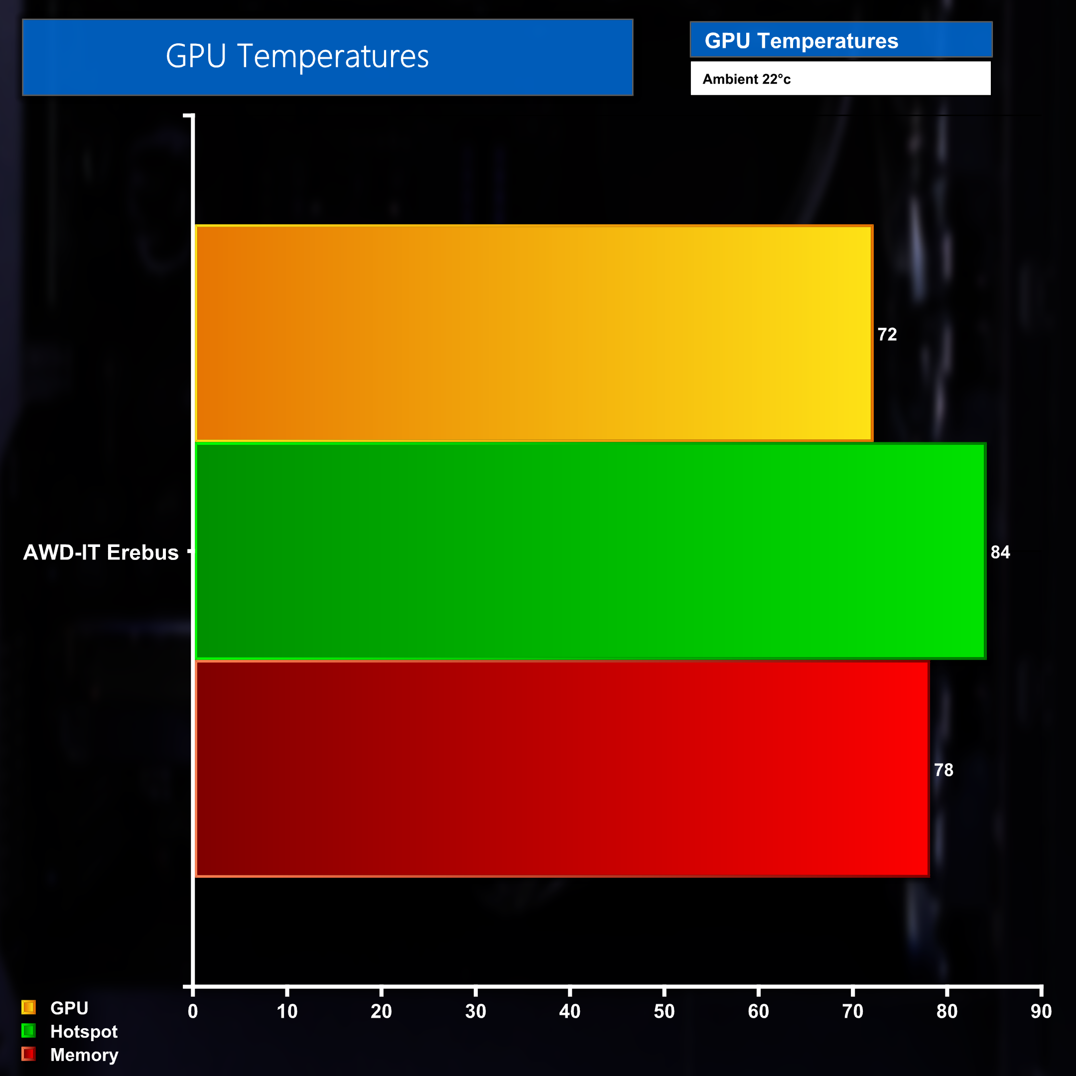 GPU temperatures when gaming were respectable, with the highest recorded reading being the hotspot sensor at 84 degrees during a 30min sustained test in Cyberpunk 2077.