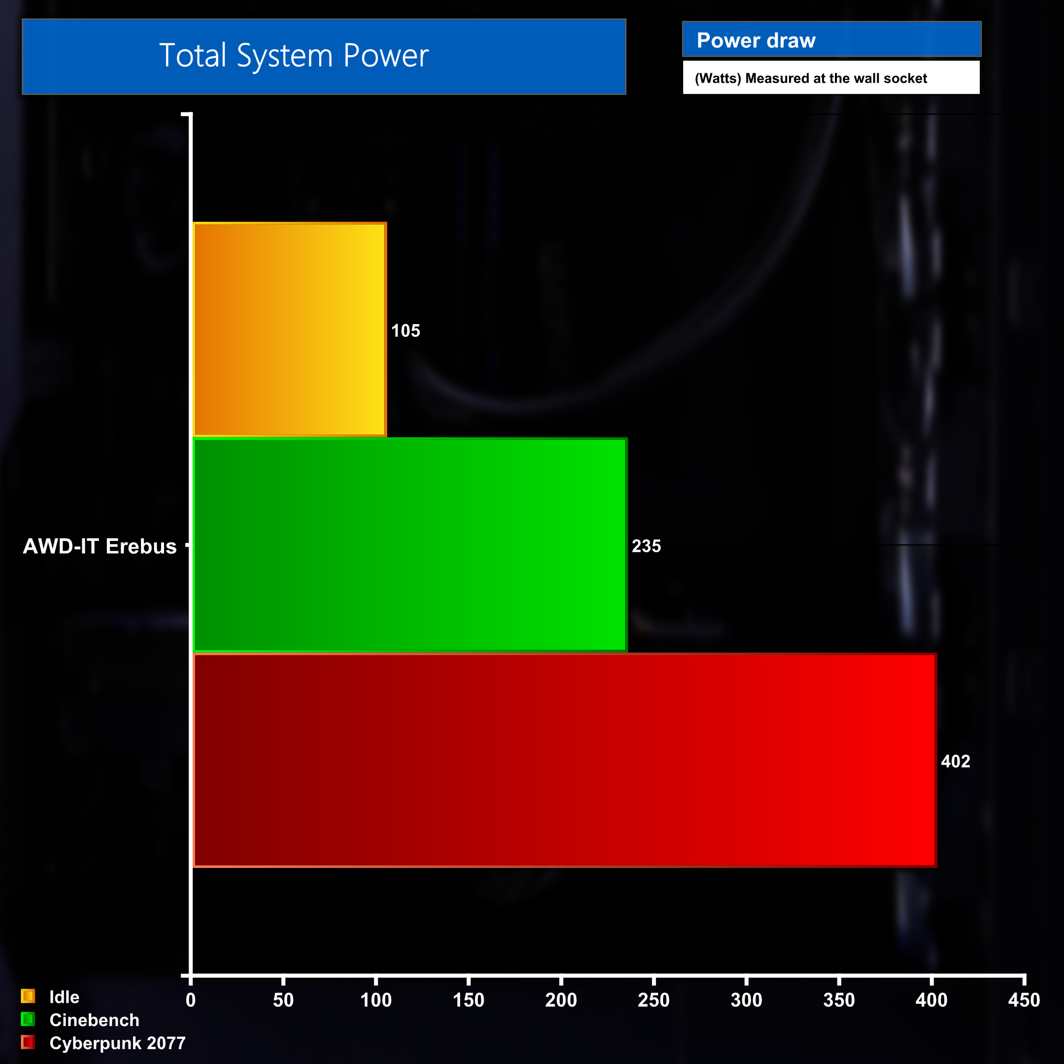 Total system power when measured at the power socket reached a peak of 402 watts when gaming in Cyberpunk 2077, while reaching a more conservative 235 watts when only stressing the CPU in Cinebench R23 multi core. When idle, the Erebus uses just 105 watts of total system power.