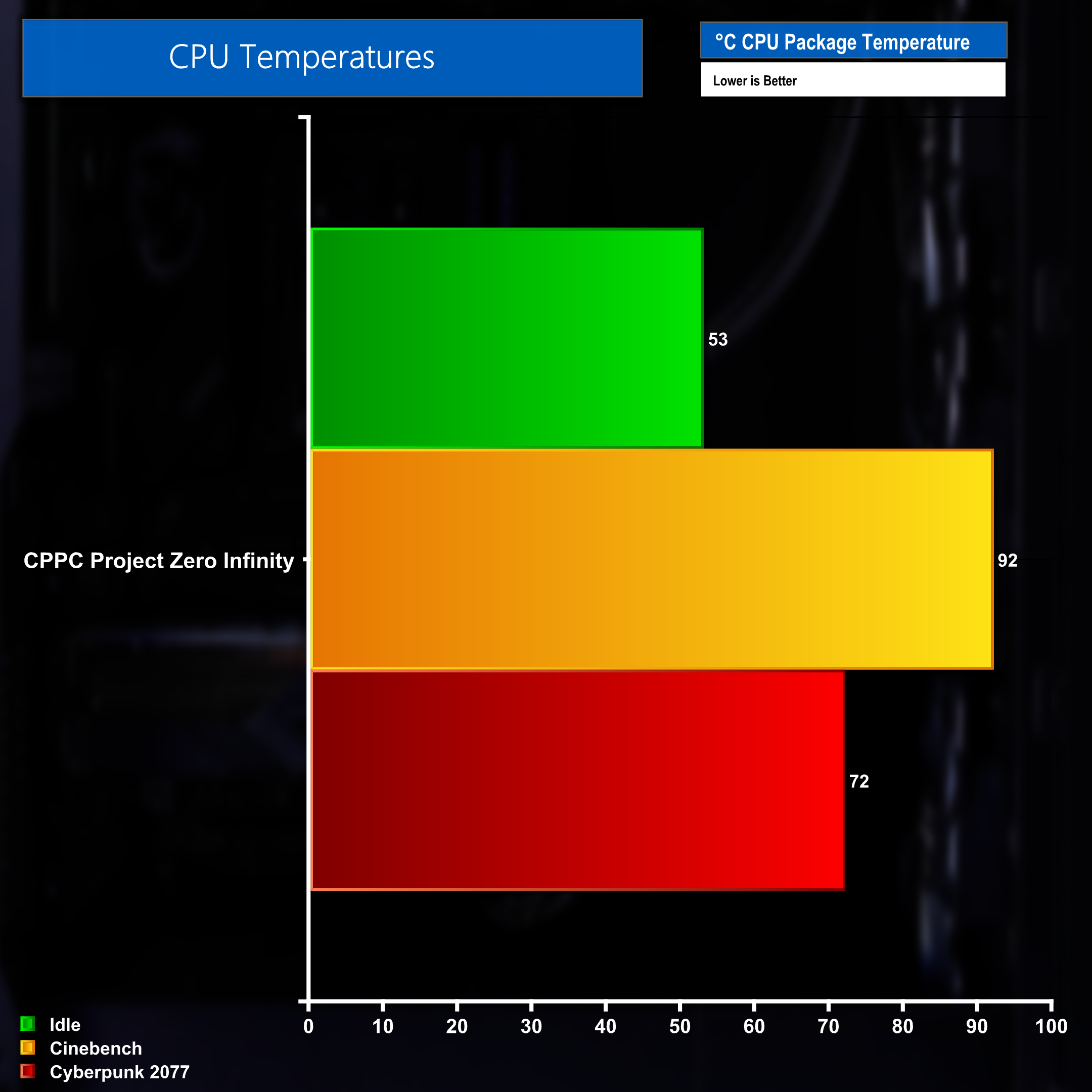 CPU package temperature mirrors the power usage figures from the previous chart, with the 14900K peaking at 92 degrees when running through a 10 minute Cinebench multicore benchmark. Things proved a little cooler when gaming, with the CPU hitting 72 degrees when playing Cyberpunk 2077. Finally, with the system idle, the Intel chip hovered around the 53 degree mark.