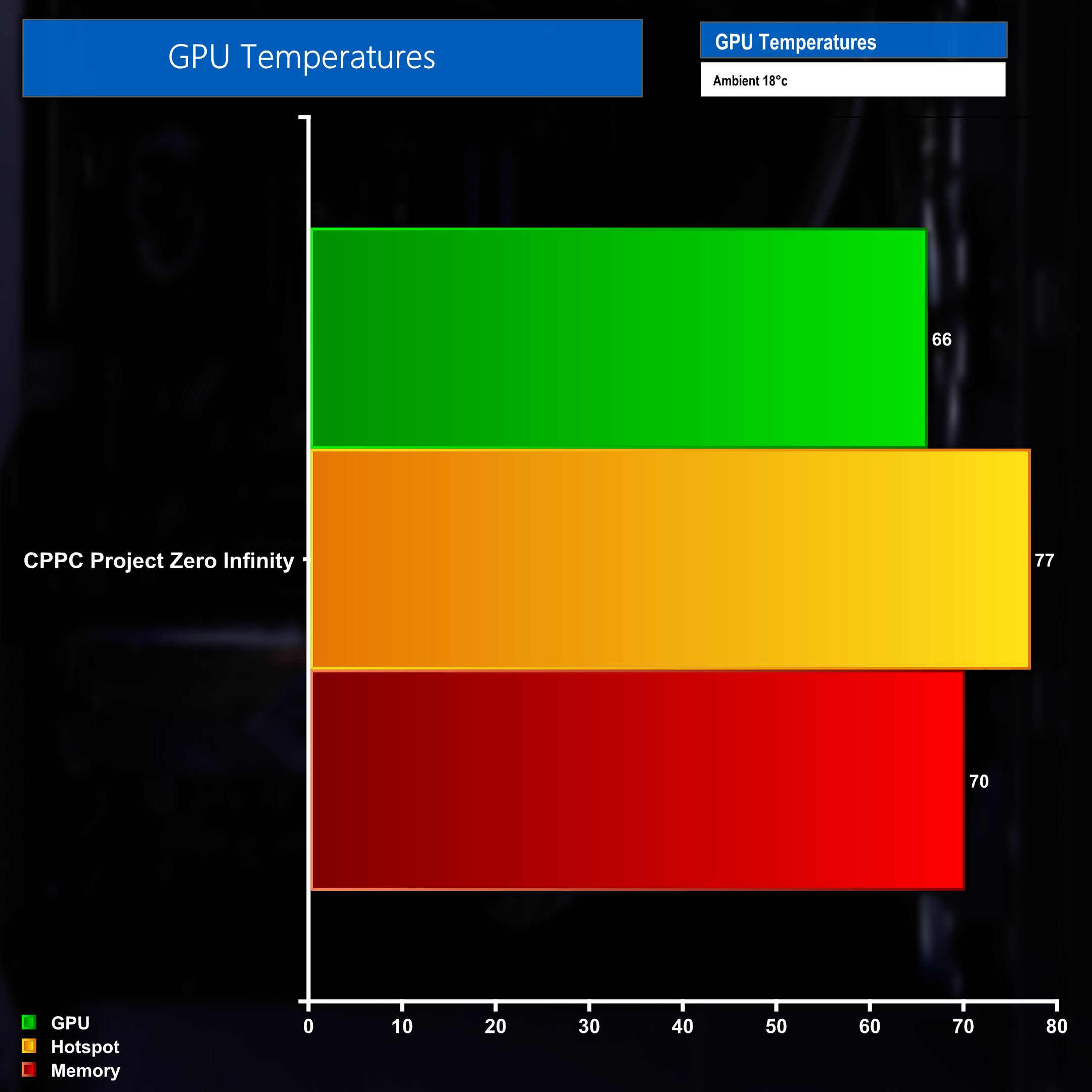 GPU temperatures, when measured after a 30 minute sustained gaming test in Cyberpunk 2077, were all fairly cool. The GPU sensor peaked at just 66 degrees, while the hotspot and memory sensors recorded 77 and 70 degrees, respectively.
