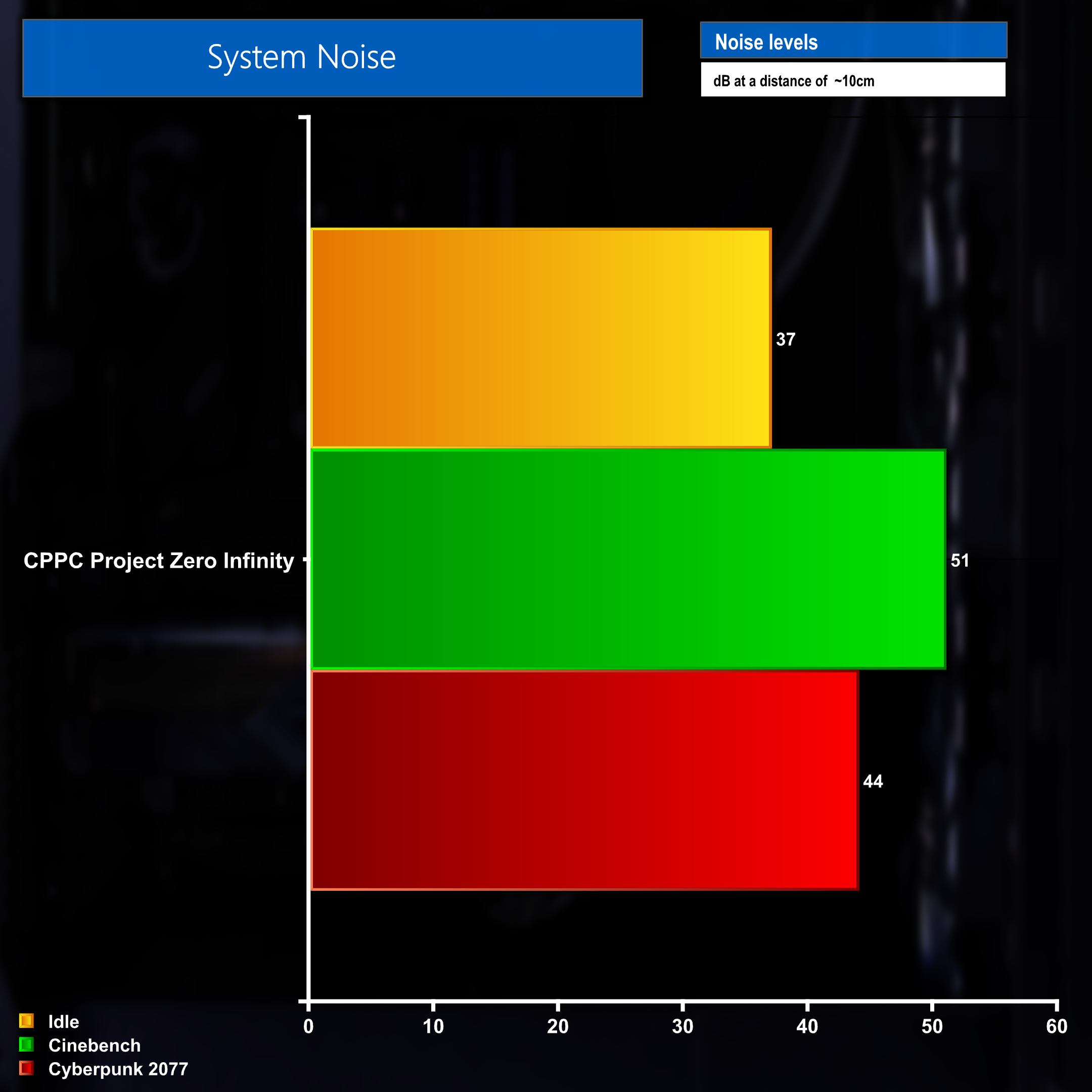 The 14900KF processor found inside the Project Zero Infinity desktop is definitely on the ‘hungrier' side of the processors released in recent times. At idle the CPU package power usage sat around the 45 Watt mark. However, when carrying out a CPU based test like Cinebench, that usage soared to the processor's maximum turbo power limit of 253 Watts. When gaming in Cyberpunk 2077, the 14900KF used just under half of that Cinebench figure, sitting at roughly 122 Watts.