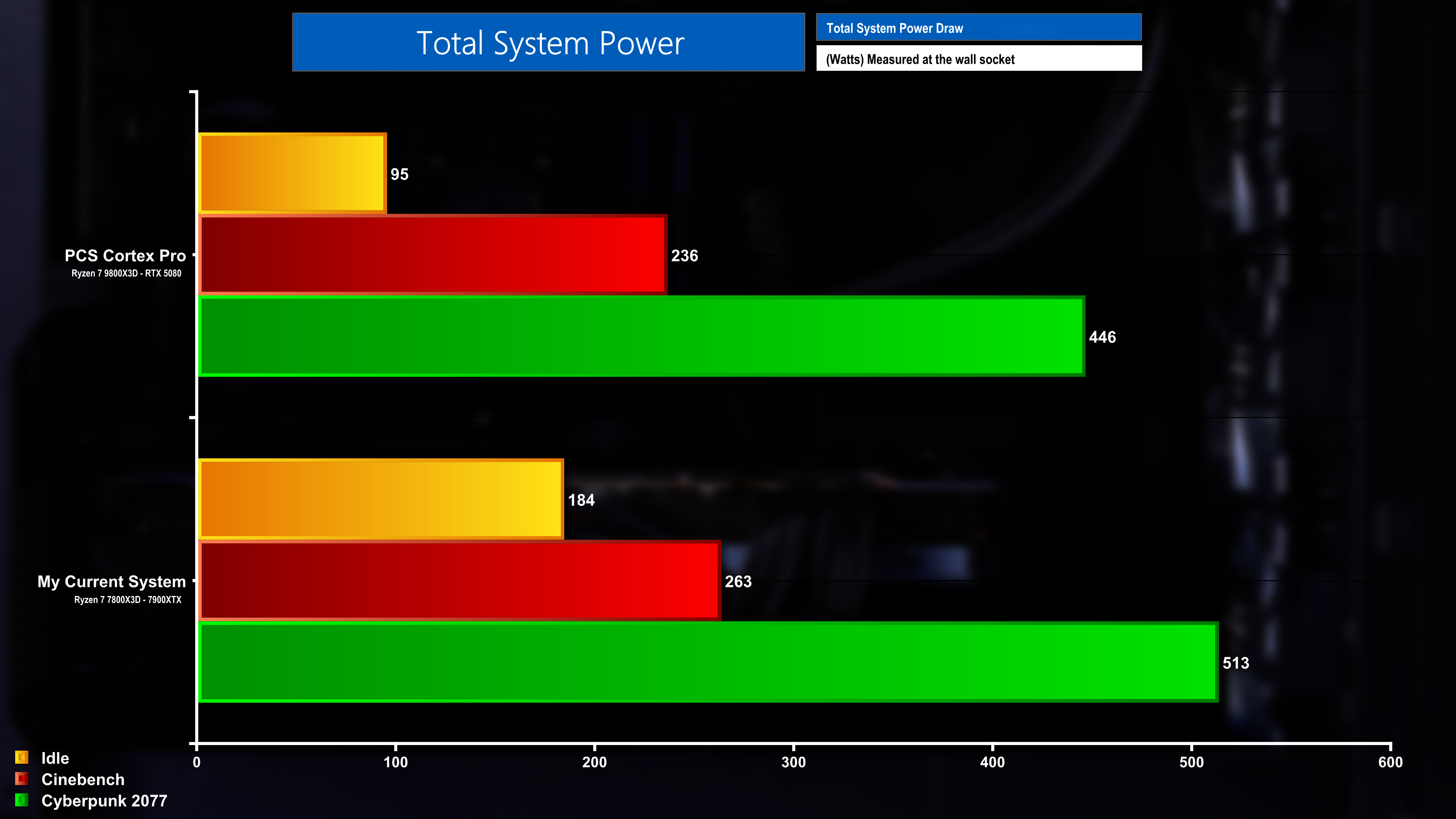 Synthetic testing resulted in the Cortex Pro comfortably beating that comparison Ryzen 7 7800X3D and AMD Radeon 7900XTX based system, as we would expect to see. Total system power draw was a particular highlight and showcases the efficiency of the newer technology found in the Cortex Pro.