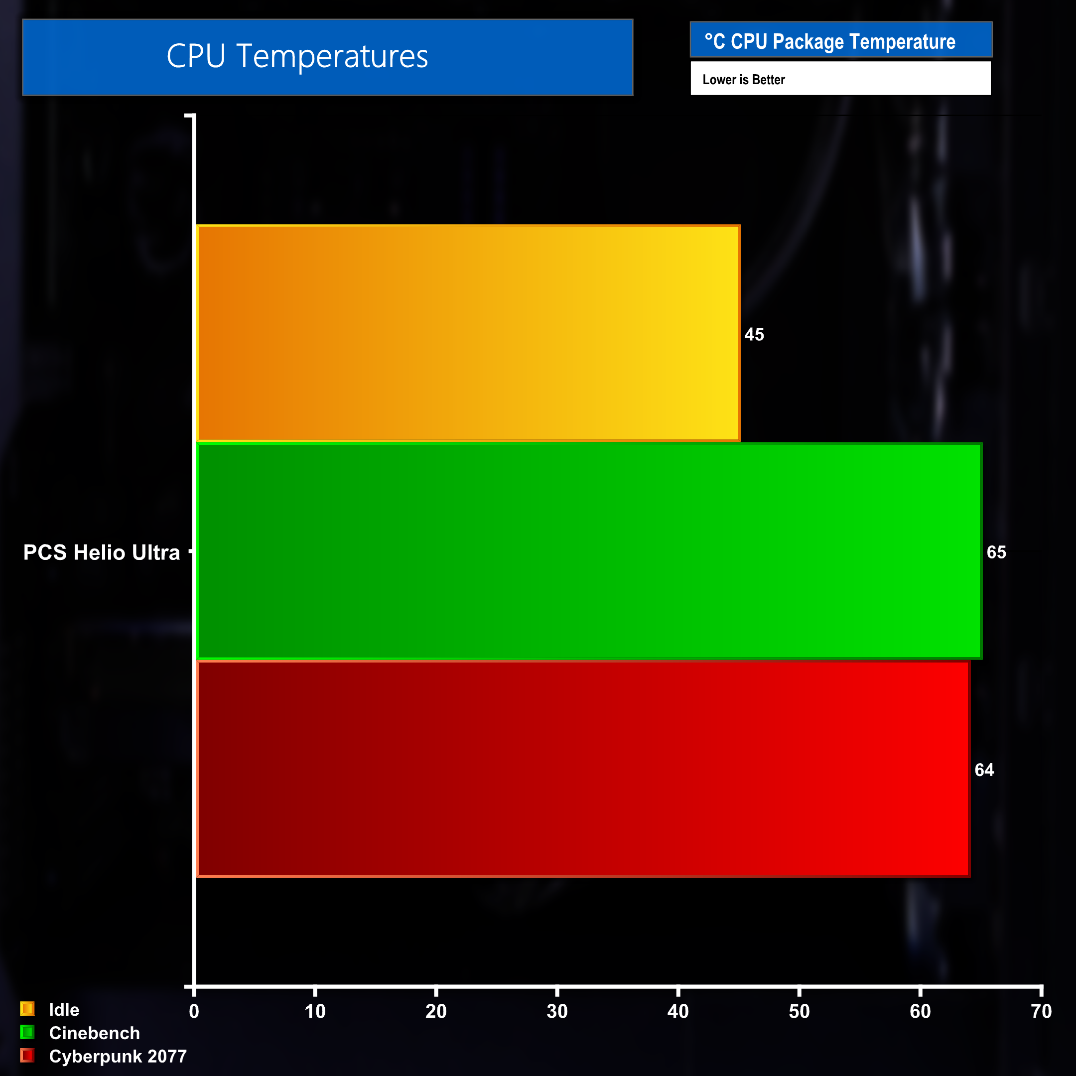 CPU temperatures reflected the power usage shown in the previous chart. The 9700X peaked at 65 degrees Celsius during a Cinebench R23 Multicore 30 minute stress test, following closely behind at 64 degrees when gaming. Idles temperatures were measured at 45 degrees. These figures show that the PCS Frostflow ARGB 240mm all in one cooler is more than capable of keeping the temperatures in check across various scenarios.