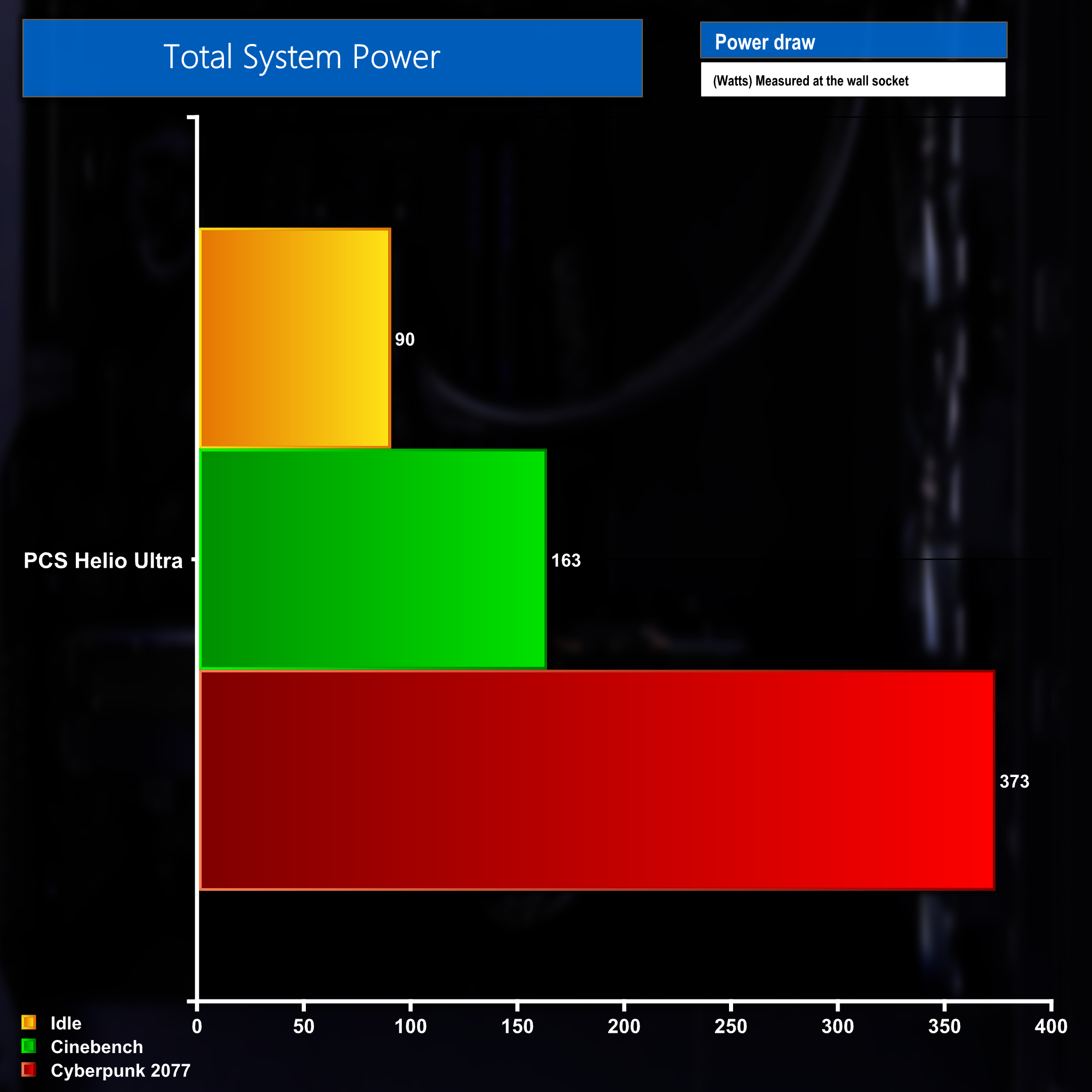 Total system power when measured at the wall socket is becoming a more important metric when considering rising energy prices across the UK. The Helio Ultra uses roughly 90W when idle, 163W when running CPU intensive workloads such as Cinebench R23 and 373W when gaming in demanding titles like Cyberpunk 2077.