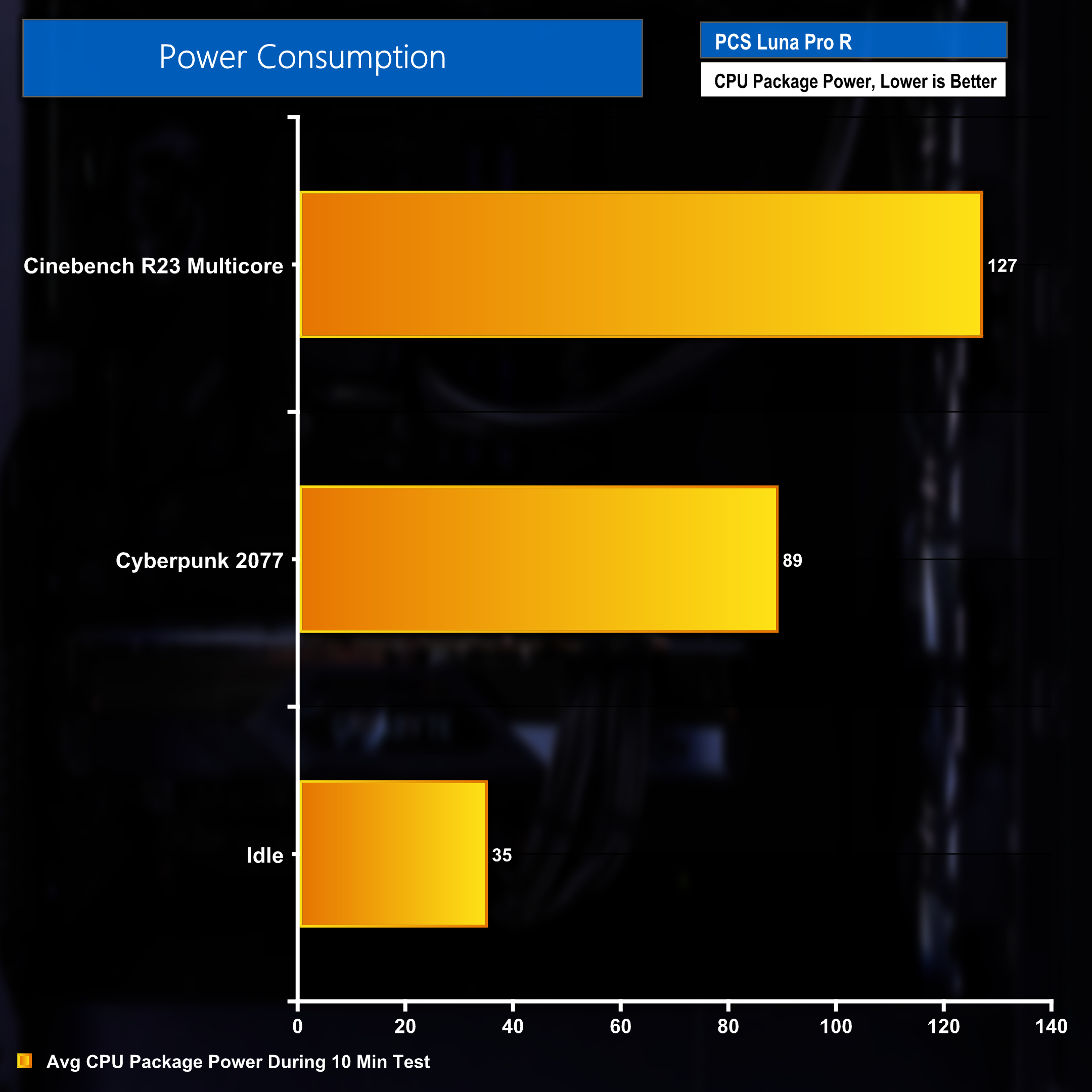 CPU package power was pushed to its peak during a 10 minute sustained multicore workload in Cinebench r23, reaching a high 127 watts. This figure fell quite significantly when testing gaming based usage in Cyberpunk 2077, with the peak usage dropping to 89 watts. While the system was idle, the total amount of power being used by the Ryzen 7 7700X was 35 watts.