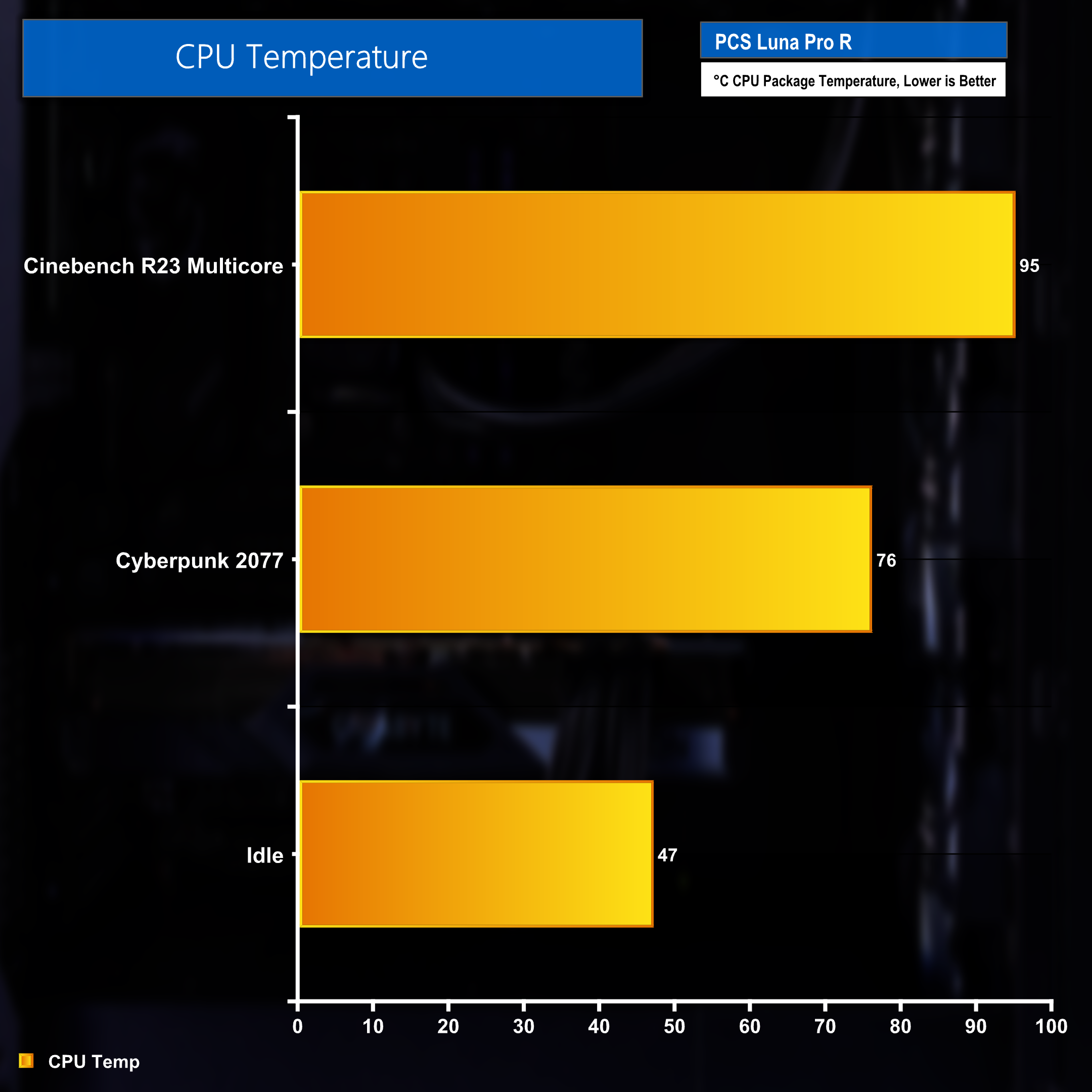 The power usage figures mentioned in the previous chart unsurprisingly correlated with results seen when CPU package temperature was recorded in the same testing environment. Temperatures peaked at 95 degrees celsius during a Cinebench r23 multicore benchmark and dropped to 76 degrees celsius during gaming. Idle temperatures were recorded at 47 degrees.